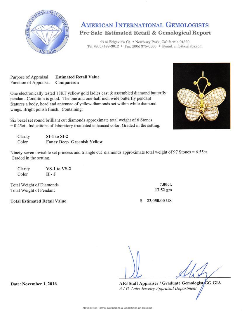 One electronically tested 18KT yellow gold ladies cast & assembled diamond butterfly pendant. The one and one-half inch wide butterfly pendant features a body, head and antennae of yellow diamonds set within white diamond wings. Bright polish finish. Condition is good. Containing: Six bezel set round brilliant cut diamonds approximate total weight of 6 Stones = 0.45ct. Indications of laboratory irradiated enhanced color. Graded in the setting. Clarity SI-1 to SI-2 Ninety-Seven invisible set princess and triangle cut diamonds approximate total weight of 97 Stones = 6.55ct. Graded in the setting. Clarity VS-1 to VS-2. Color: H - J. Total Weight of Diamonds 7.00ct.. Total Weight of Pendant 17.52gm. AIG Appraised at $23,050.00.