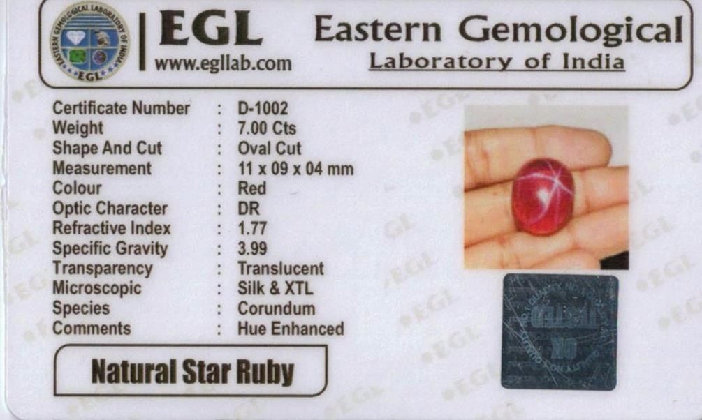 7.00ct Oval Cut Red Star Thailand Ruby; EGL Certified; 11 mm x 09 mm x 04 mm
