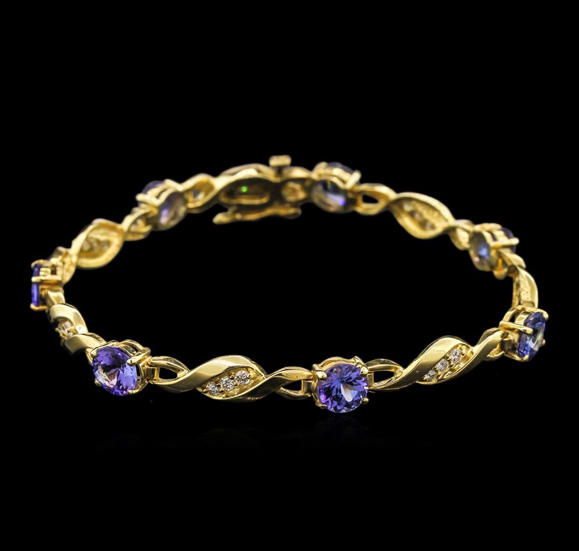 One electronically tested 14KT yellow gold lady's combination cast & assembled ribbon bracelet with a tongue clasp with foldover safety with a bright polish finish. The featured lady's bracelet is 7.00 inches in length. Identified with markings of "14K". Condition is new, good workmanship. Containing: Seven prong set round modified brilliant cut natural tanzanites, measuring 6.10 - 6.00 x 3.90 mm, 3% bulge factor, approximate total weight of 7.00ct., clarity is eye clean, type I, medium light, very slightly grayish, bluish violet color, (GIA bV 4/3), cut is good. Transmitting light with no distortion, transparent. Colored gemstones are presumed to have been subjected to commonly used enhancement processes. Graded in the setting. Twenty-One prong set round brilliant cut diamonds, measuring 1.90 - 1.80 x 1.20mm (depth est.) approximate total weight of 21 Stones = 0.54ct. Graded in the setting. Clarity: VS-2 to SI-1. Color: G - Good. Total Weight of Colored Stones 7.00ct. Total Weight of Diamonds 0.54ct. Total Weight of Bracelet 11.60gm. GAS Appraised at $4,955.00.