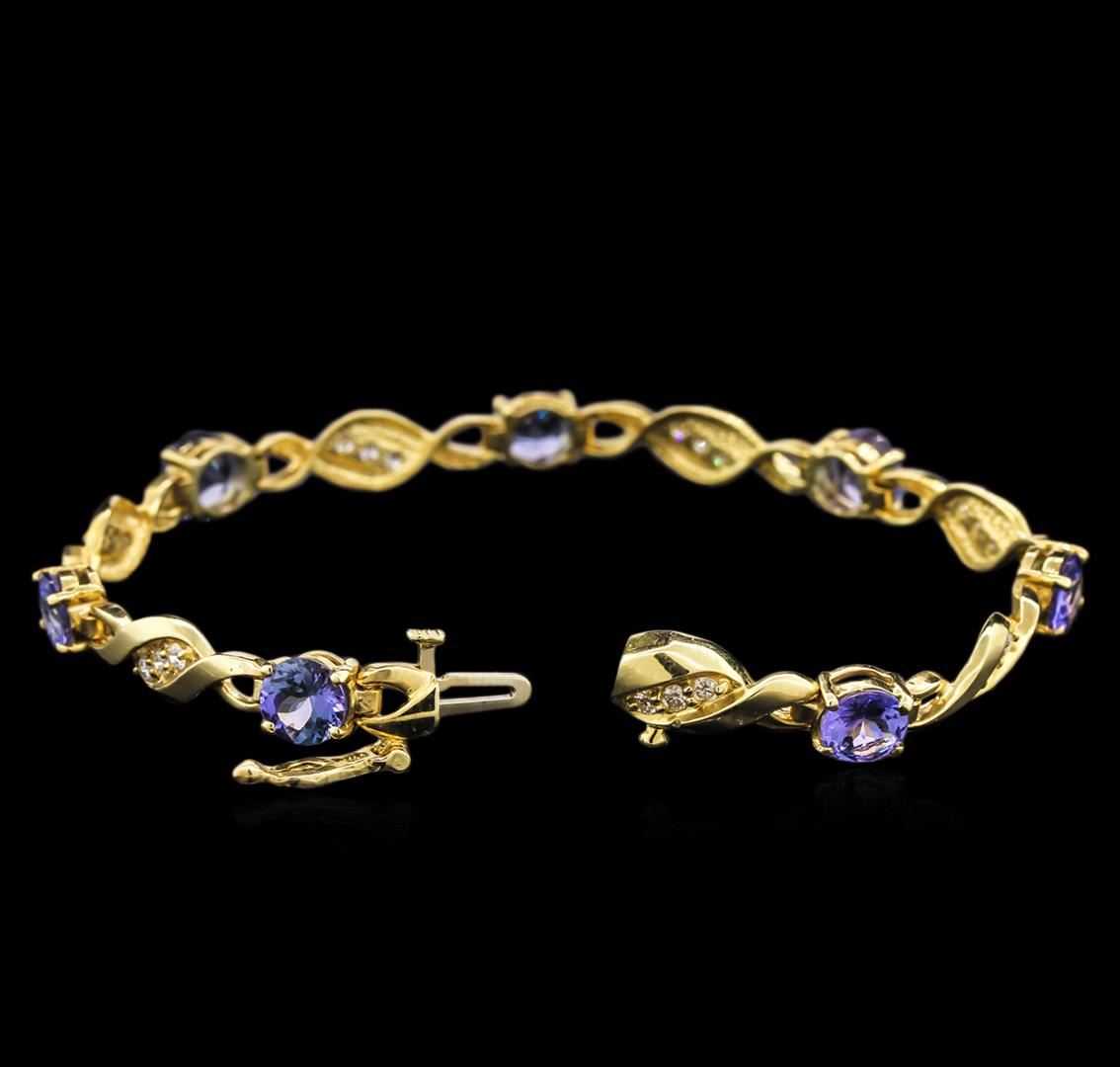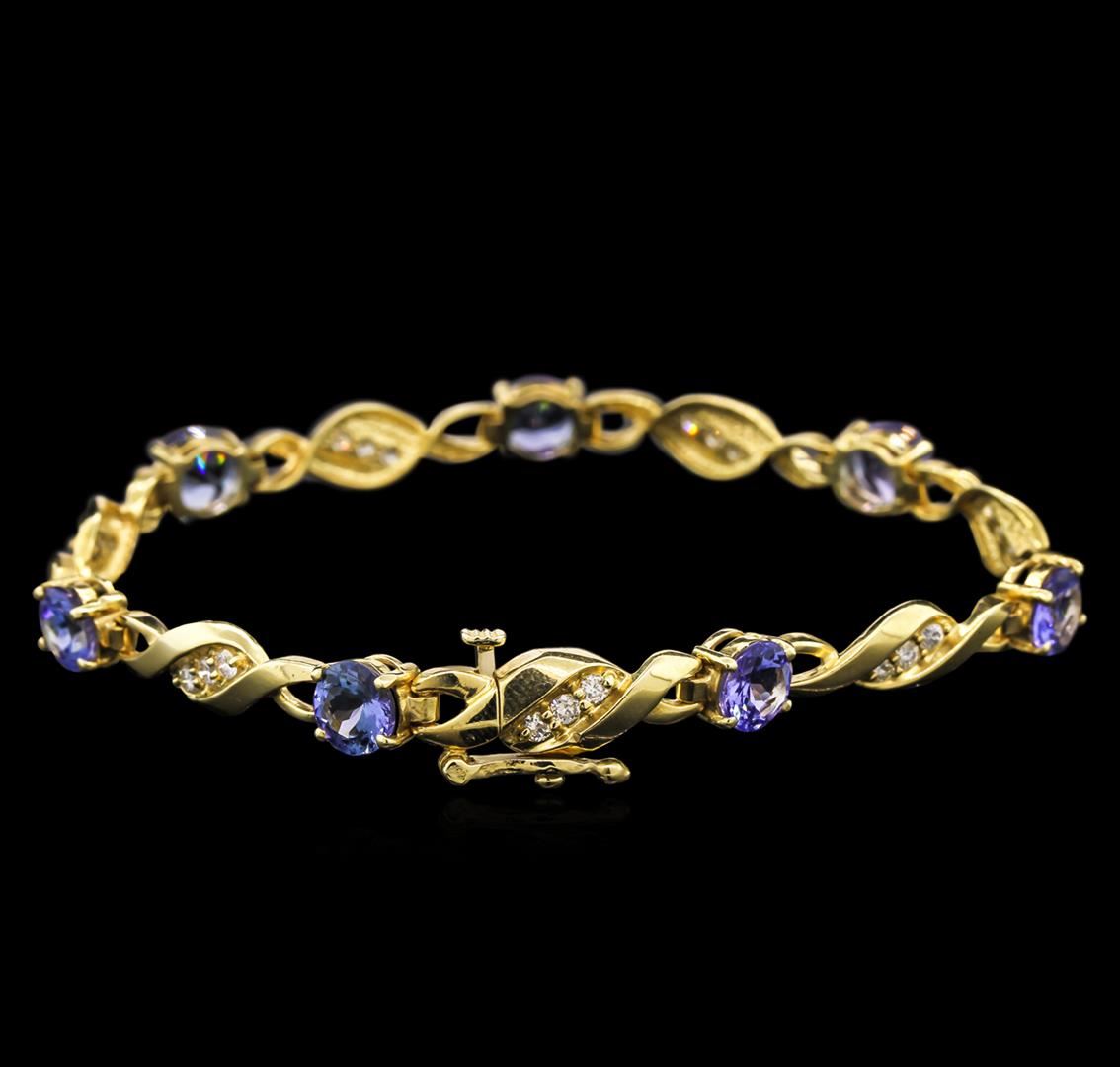 One electronically tested 14KT yellow gold lady's combination cast & assembled ribbon bracelet with a tongue clasp with foldover safety with a bright polish finish. The featured lady's bracelet is 7.00 inches in length. Identified with markings of "14K". Condition is new, good workmanship. Containing: Seven prong set round modified brilliant cut natural tanzanites, measuring 6.10 - 6.00 x 3.90 mm, 3% bulge factor, approximate total weight of 7.00ct., clarity is eye clean, type I, medium light, very slightly grayish, bluish violet color, (GIA bV 4/3), cut is good. Transmitting light with no distortion, transparent. Colored gemstones are presumed to have been subjected to commonly used enhancement processes. Graded in the setting. Twenty-One prong set round brilliant cut diamonds, measuring 1.90 - 1.80 x 1.20mm (depth est.) approximate total weight of 21 Stones = 0.54ct. Graded in the setting. Clarity: VS-2 to SI-1. Color: G - Good. Total Weight of Colored Stones 7.00ct. Total Weight of Diamonds 0.54ct. Total Weight of Bracelet 11.60gm. GAS Appraised at $4,955.00.
