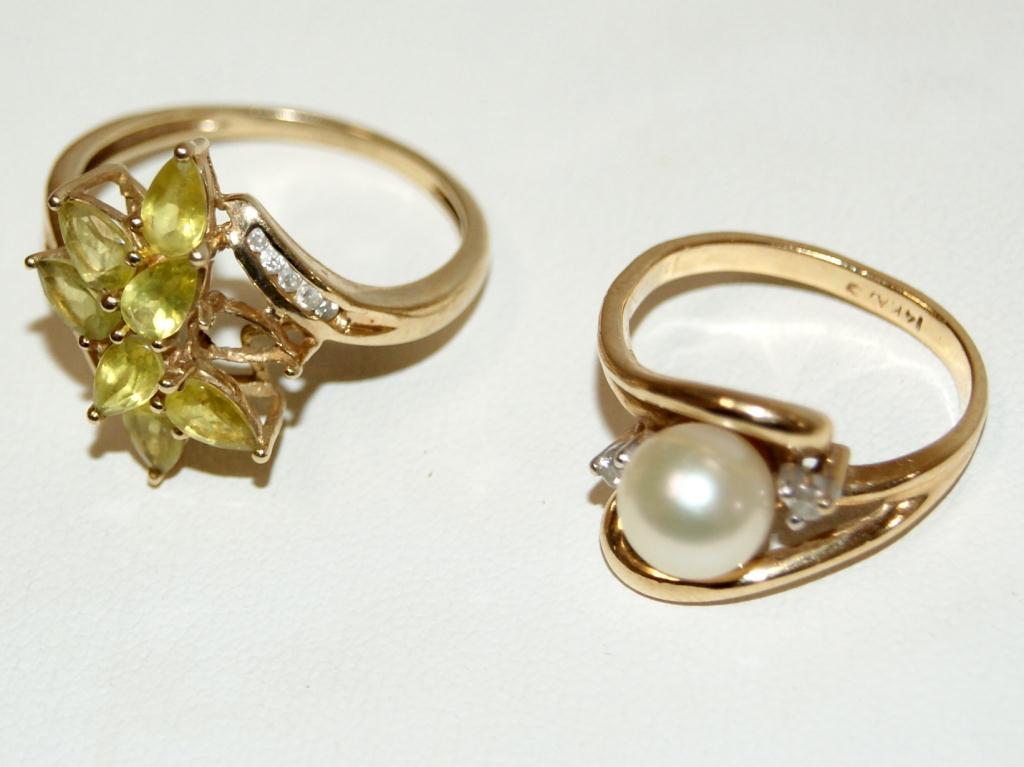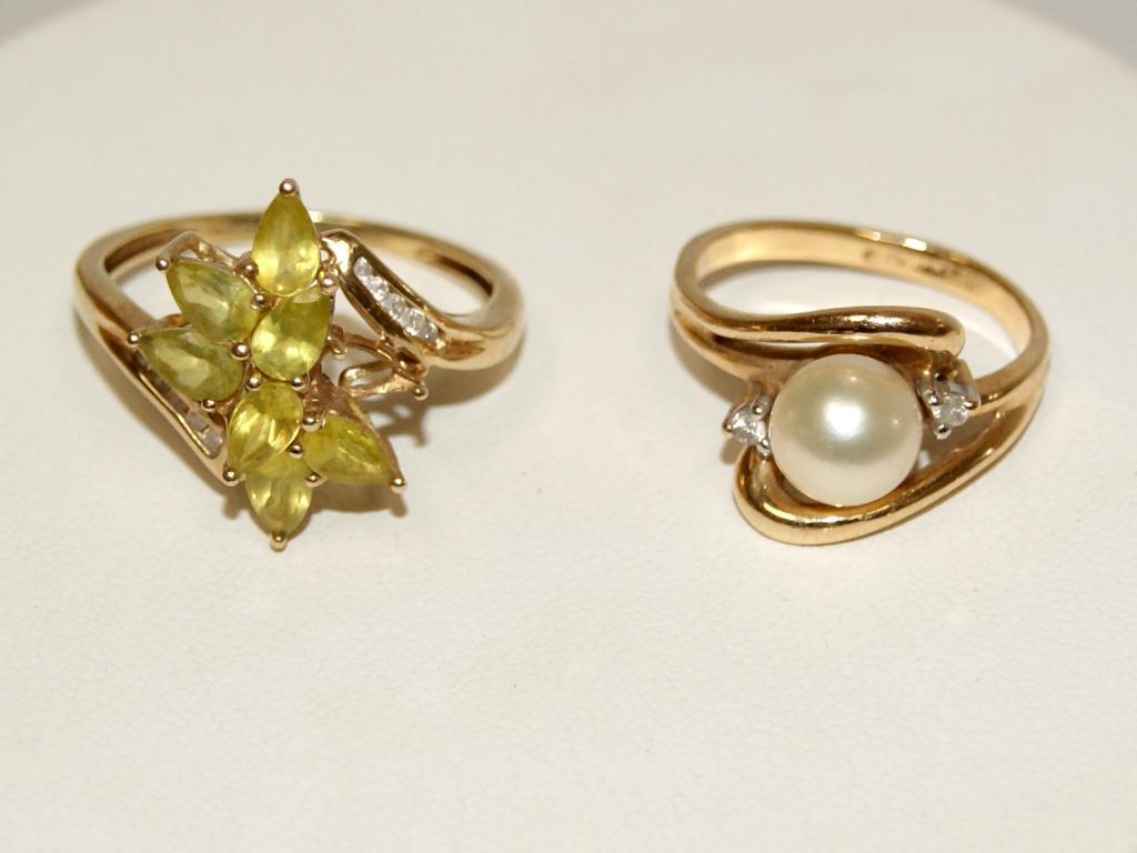 Total Retail $4,130 10Kt & 14Kt Yellow Gold Being Sold Times Money (#1) Retail Price $2,190 14Kt Yellow Gold 7.00mm White Pearl & Diamonds Ladies Ring (#2) Retail Price $1,940 10Kt Yellow Gold AAA Lemon Green Peridot Cluster Ladies Ring
