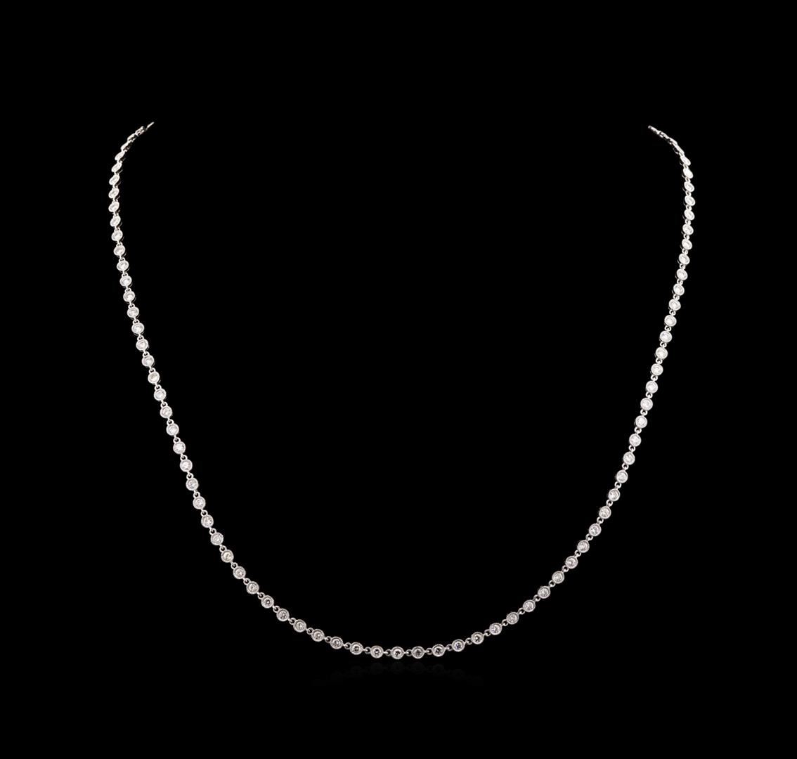 One electronically tested 18KT white gold lady's combination cast & assembled diamonds by the yard necklace with a concealed clasp with a bright polish with milgrain detailing finish. The featured lady's necklace measures 24 inches in length. Trademark is MICHA. Identified with markings of "18K 750". Condition is new, good workmanship. Containing: One Hundred Eight bezel set round brilliant cut diamonds, measuring 2.60 - 2.50 x 1.58mm (depth est.) approximate total weight of 108 Stones = 6.76ct. Graded in the setting. Clarity: VS-1 to VS-2. Color: G - Very Good Twenty-Five prong set round brilliant cut diamonds, measuring 1.40 - 1.35 x 0.86mm (depth est.) approximate total weight of 25 Stones = 0.25ct. Graded in the setting. Clarity: VS-2 to SI-1. Color: G - Very Good. Total Weight of Diamonds 7.01ct. Total Weight of Necklace 20.60gm. GAS Appraised at $23,020.00.
