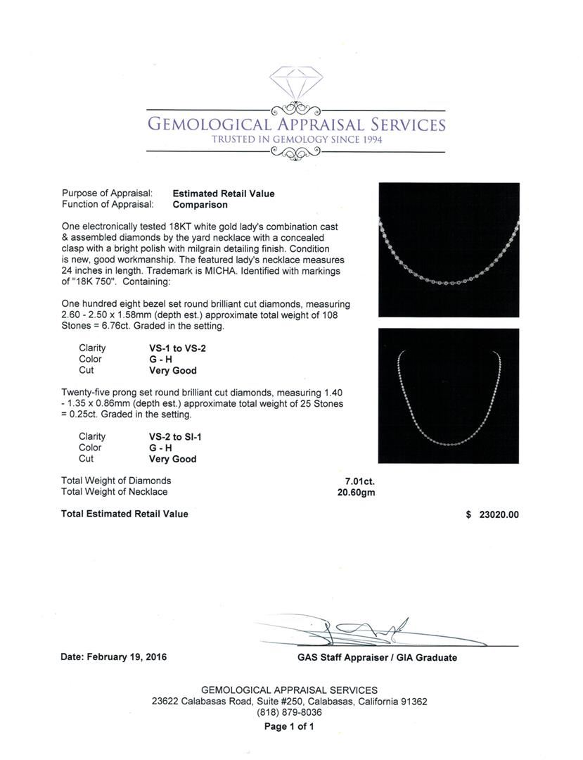 One electronically tested 18KT white gold lady's combination cast & assembled diamonds by the yard necklace with a concealed clasp with a bright polish with milgrain detailing finish. The featured lady's necklace measures 24 inches in length. Trademark is MICHA. Identified with markings of "18K 750". Condition is new, good workmanship. Containing: One Hundred Eight bezel set round brilliant cut diamonds, measuring 2.60 - 2.50 x 1.58mm (depth est.) approximate total weight of 108 Stones = 6.76ct. Graded in the setting. Clarity: VS-1 to VS-2. Color: G - Very Good Twenty-Five prong set round brilliant cut diamonds, measuring 1.40 - 1.35 x 0.86mm (depth est.) approximate total weight of 25 Stones = 0.25ct. Graded in the setting. Clarity: VS-2 to SI-1. Color: G - Very Good. Total Weight of Diamonds 7.01ct. Total Weight of Necklace 20.60gm. GAS Appraised at $23,020.00.