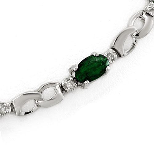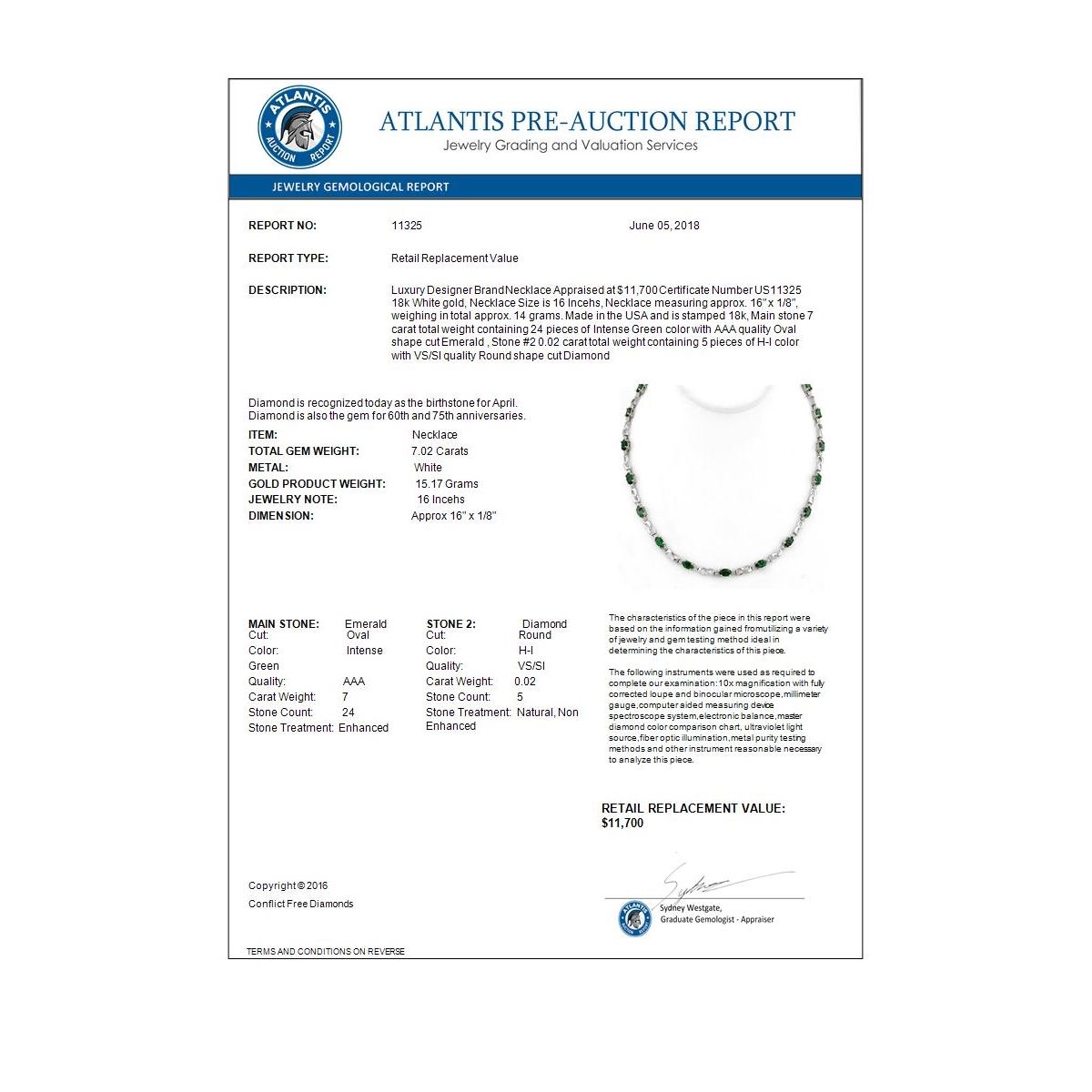 REF-163X6T -11325 ---- 7.02 CTW Emerald & Diamond Necklace 18K White Gold ---- Luxury Designer Brand Necklace Appraised at $11,700 Certificate Number US11325 18k White gold, Necklace Size is 16 Incehs, Necklace measuring approx. 16" x 1/8", weighing in total approx. 14 grams. Made in the USA and is stamped 18k, Main stone 7 carat total weight containing 24 pieces of Intense Green color with AAA quality Oval shape cut Emerald , Stone #2 0.02 carat total weight containing 5 pieces of H-I color with VS/SI quality Round shape cut Diamond