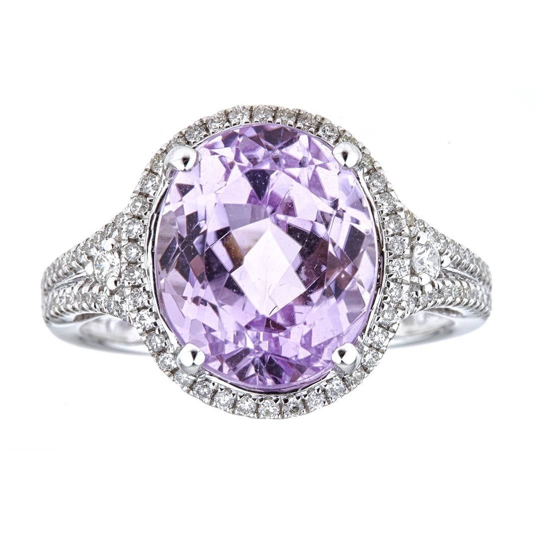 One Kunzite and Diamond Ring featuring: 14KT White Gold with a total weight of 3.43 grams, Kunzite with a total weight of 7.02ct, and 88 Round Cut Diamonds with a total weight of 0.37ctw.
