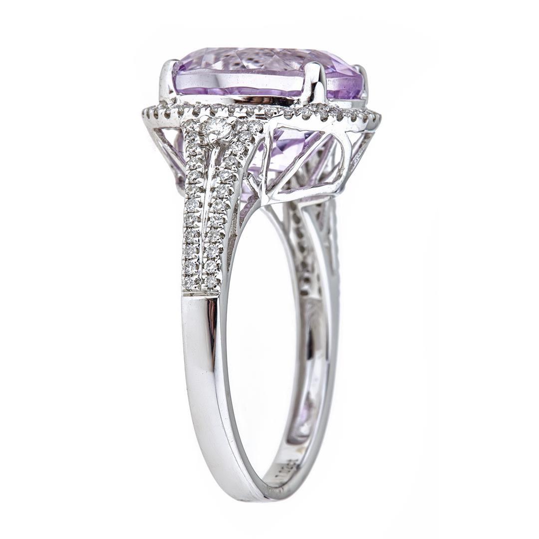 One Kunzite and Diamond Ring featuring: 14KT White Gold with a total weight of 3.43 grams, Kunzite with a total weight of 7.02ct, and 88 Round Cut Diamonds with a total weight of 0.37ctw.
