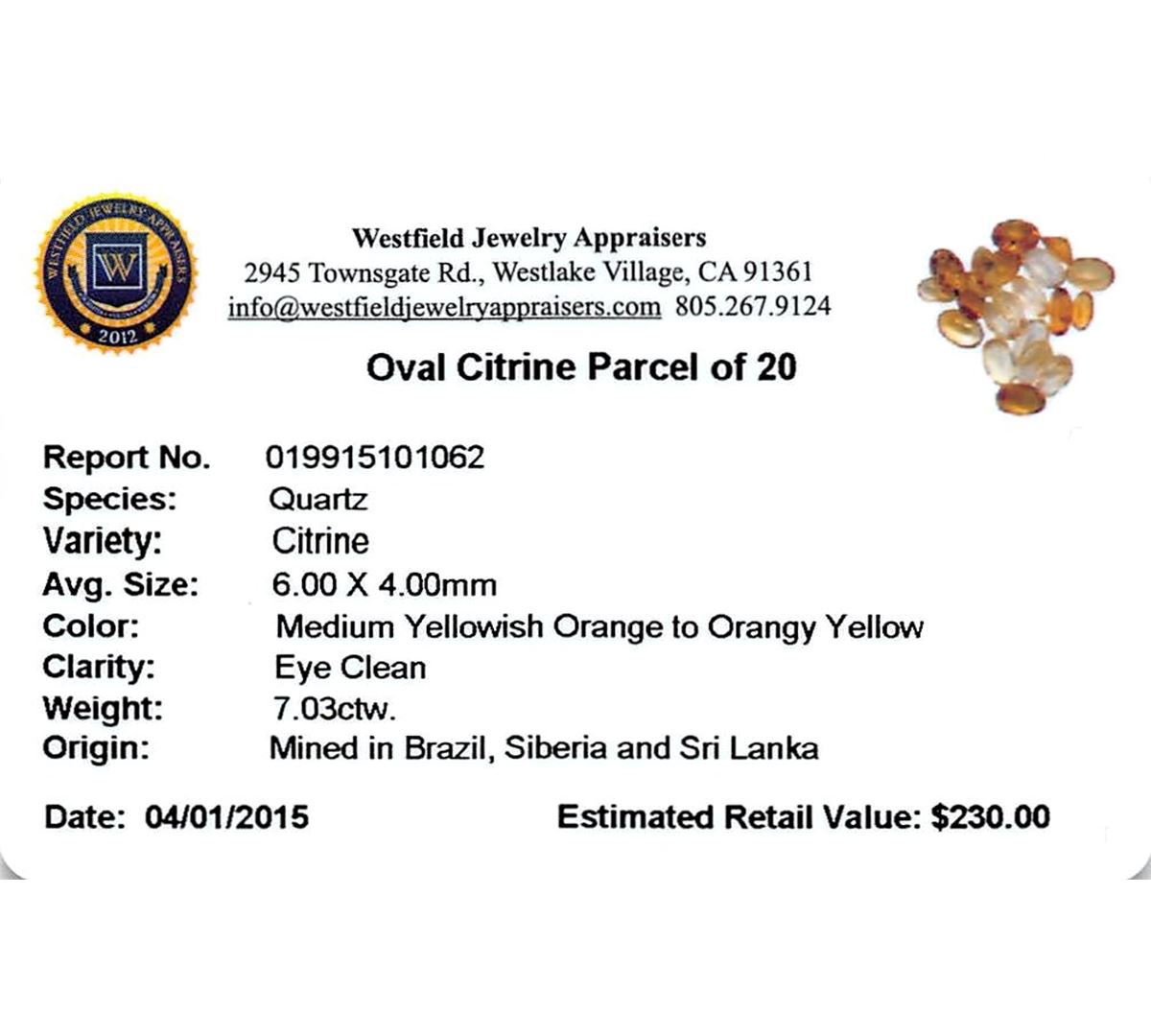 Twenty oval mixed cut natural citrine quartzs exact total weight 7.03ct., clarity is eye clean, type I, medium dark, brownish, yellowish orange color, (GIA yO 6/3), cut is good. Westfield Appraised at $230.00.