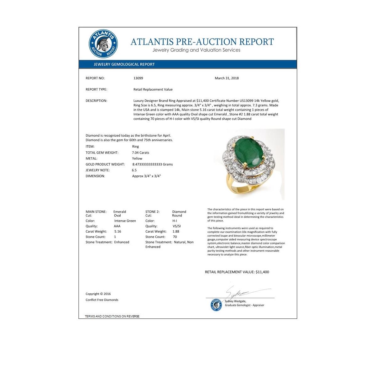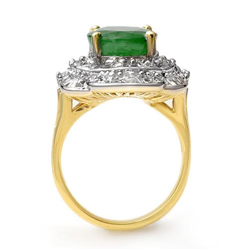REF-159N3Y -13099 ---- 7.04 CTW Emerald & Diamond Ring 14K Yellow Gold ---- Luxury Designer Brand Ring Appraised at $11,400 Certificate Number US13099 14k Yellow gold, Ring Size is 6.5, Ring measuring approx. 3/4" x 3/4" , weighing in total approx. 7.3 grams. Made in the USA and is stamped 14k, Main stone 5.16 carat total weight containing 1 pieces of Intense Green color with AAA quality Oval shape cut Emerald , Stone #2 1.88 carat total weight containing 70 pieces of H-I color with VS/SI quality Round shape cut Diamond