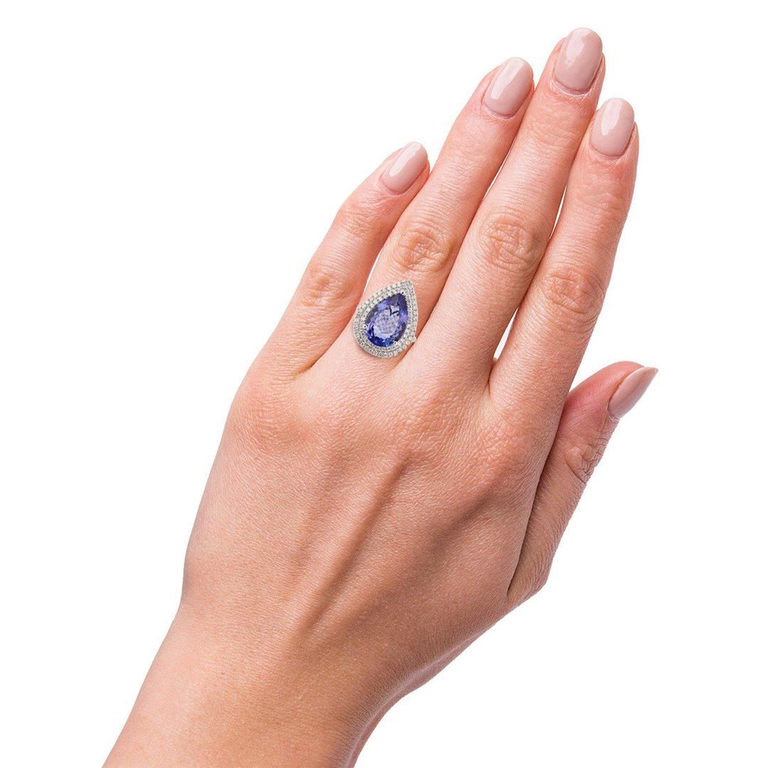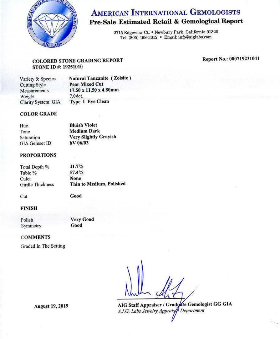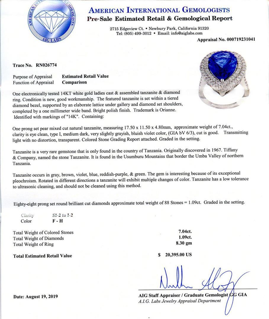 One electronically tested 14KT white gold ladies cast & assembled tanzanite & diamond ring. Condition is new, good workmanship. The featured tanzanite is set within a tiered diamond bezel, supported by an elaborate lattice under gallery and diamond set shoulders, completed by a one millimeter wide band. Bright polish finish. Trademark is Orianne. Identified with markings of "14K". Containing: One prong set pear mixed cut natural tanzanite, measuring 17.50 x 11.50 x 4.80mm, approximate weight of 7.04ct., clarity is eye clean, type I, medium dark, very slightly grayish, bluish violet color, (GIA bV 6/3), cut is good. Transmitting light with no distortion, transparent. Colored Stone Grading Report attached. Graded in the setting. Tanzanite is a very rare gemstone that is only found in the country of Tanzania. Originally discovered in 1967. Tiffany & Company, named the stone Tanzanite. It is found in the Usumburu Mountains that border the Umba Valley of northern Tanzania. Tanzanite occurs in gray, brown, violet, blue, reddish-purple, & green. The gem is interesting because of its exceptional pleochroism. Rotated in different directions a tanzanite will exhibit multiple changes of color. Tanzanite has a low tolerance to ultrasonic cleaning, and should not be cleaned using this method. Eighty-eight prong set round brilliant cut diamonds approximate total weight of 88 Stones = 1.09ctw. Graded in the setting. Clarity SI2 to I2 Color F - H Total Weight of Colored Stones 7.04ct. Total Weight of Diamonds 1.09ctw. Total Weight of Ring 8.30 gm