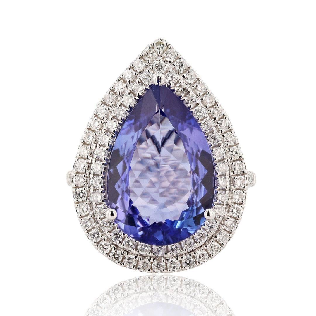One electronically tested 14KT white gold ladies cast & assembled tanzanite & diamond ring. Condition is new, good workmanship. The featured tanzanite is set within a tiered diamond bezel, supported by an elaborate lattice under gallery and diamond set shoulders, completed by a one millimeter wide band. Bright polish finish. Trademark is Orianne. Identified with markings of "14K". Containing: One prong set pear mixed cut natural tanzanite, measuring 17.50 x 11.50 x 4.80mm, approximate weight of 7.04ct., clarity is eye clean, type I, medium dark, very slightly grayish, bluish violet color, (GIA bV 6/3), cut is good. Transmitting light with no distortion, transparent. Colored Stone Grading Report attached. Graded in the setting. Tanzanite is a very rare gemstone that is only found in the country of Tanzania. Originally discovered in 1967. Tiffany & Company, named the stone Tanzanite. It is found in the Usumburu Mountains that border the Umba Valley of northern Tanzania. Tanzanite occurs in gray, brown, violet, blue, reddish-purple, & green. The gem is interesting because of its exceptional pleochroism. Rotated in different directions a tanzanite will exhibit multiple changes of color. Tanzanite has a low tolerance to ultrasonic cleaning, and should not be cleaned using this method. Eighty-eight prong set round brilliant cut diamonds approximate total weight of 88 Stones = 1.09ctw. Graded in the setting. Clarity SI2 to I2 Color F - H Total Weight of Colored Stones 7.04ct. Total Weight of Diamonds 1.09ctw. Total Weight of Ring 8.30 gm