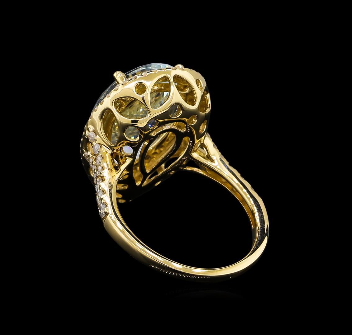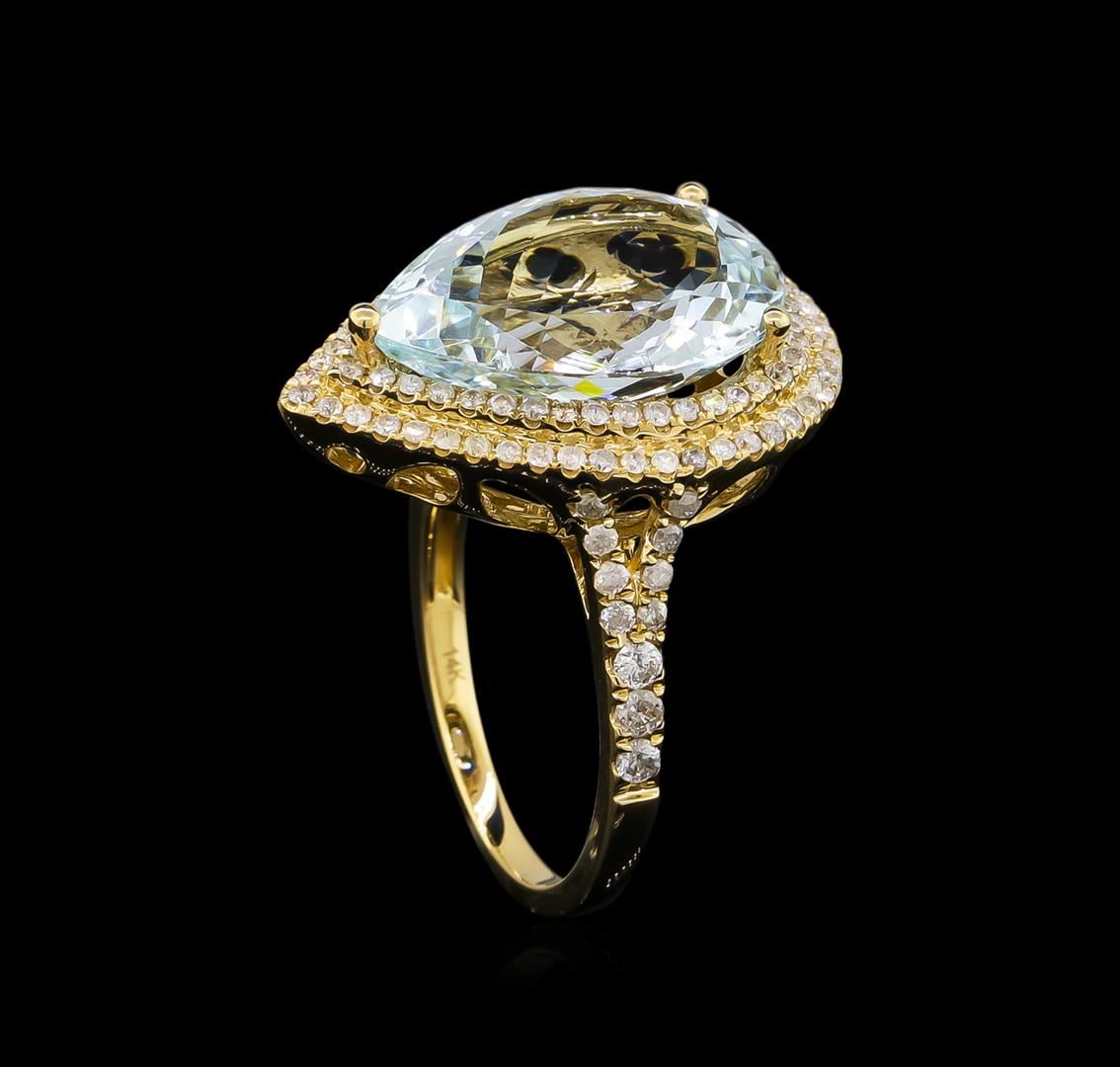 One electronically tested 14KT yellow gold lady's cast fashion ring with a split shank double basket halo with a bright polish finish. The featured lady's ring has a shank measuring 1.74 millimeters wide. Trademark is Orianne. Identified with markings of "14K". Condition is new, good workmanship. Containing: One prong set pear modified brilliant cut natural aquamarine, measuring 16.90 x 11.67 x 6.50mm, approximate weight of 7.05ct., clarity is eye clean, type I, light, moderately strong, very slightly greenish blue color, (GIA vslgB 3/4), cut is very good. Transmitting light with no distortion, transparent. Colored gemstones are presumed to have been subjected to commonly used enhancement processes. Graded in the setting. Six prong set round brilliant cut diamonds, measuring 1.90 - 1.80 x 1.11mm (depth est.) approximate total weight of 6 Stones = 0.13ct. Graded in the setting. Clarity: SI-1 to I-1. Color: H - I. Cut Good One Hundred Two prong set round brilliant cut diamonds, measuring 1.30 - 1.15 x 0.74mm (depth est.) approximate total weight of 102 Stones = 0.63ct. Graded in the setting. Clarity: I-1 to I-2. Color: H - I. Cut Good. Total Weight of Colored Stones 7.05ct. Total Weight of Diamonds 0.76ct. Total Weight of Ring 6.70gm. GAS Appraised at $11,680.00.