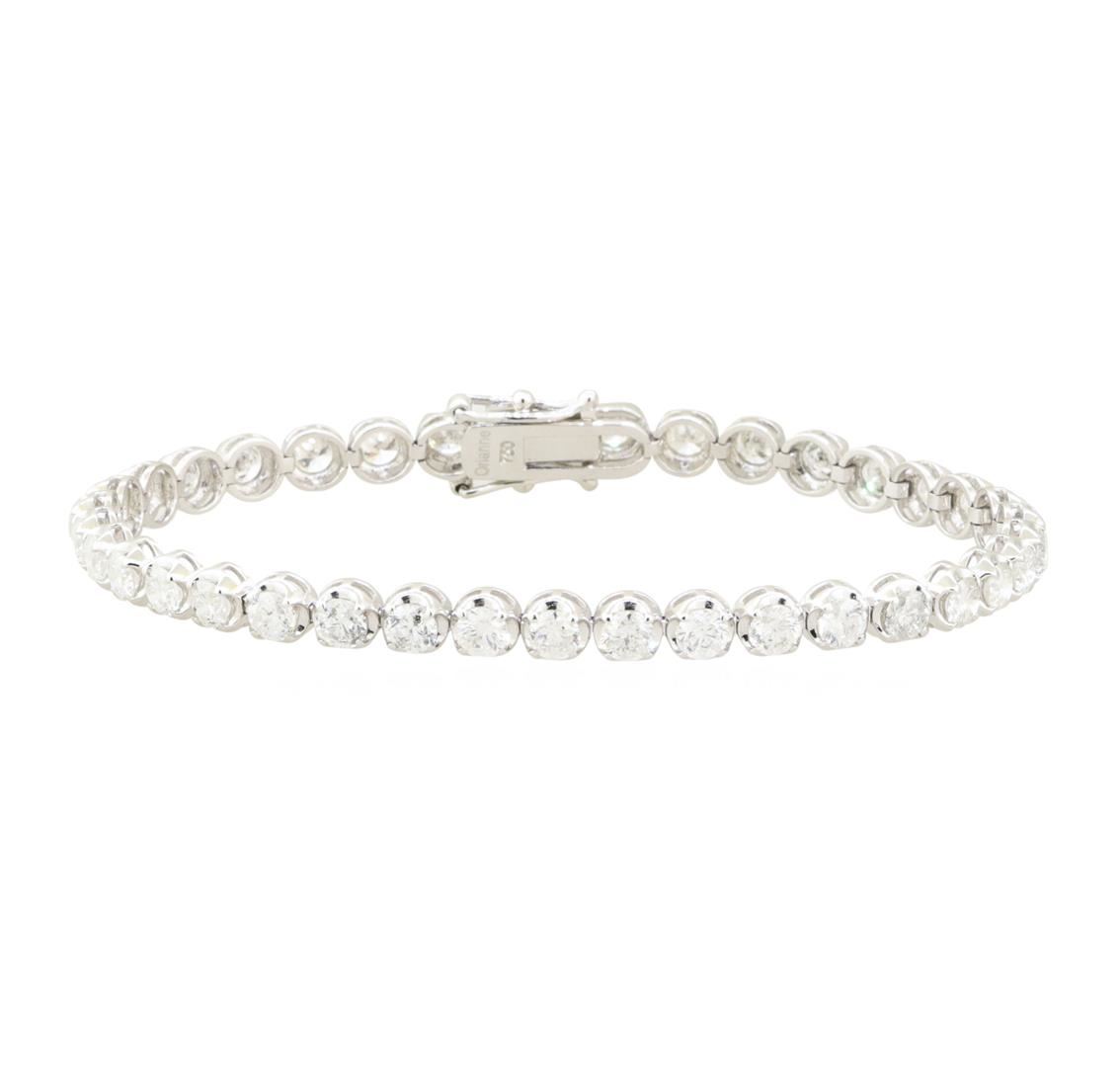 One electronically tested 18KT white gold ladies cast & assembled diamond tennis bracelet. The seven and one quarter inch length bracelet features a flexible diamond ribbon, terminating in a concealed clasp with twin safeties. Trademark is Orianne. Identified with markings of "750." Bright polish finish.Tennis bracelets & necklaces got their unusual name from an incident involving the U.S. professional tennis player Chris Evert during a tennis match in the 1980's. Evert had been wearing an expensive diamond bracelet, an inline string of individually-set diamonds. Previously these bracelets were known as eternity bracelets. When the clasp snapped during play, she asked the officials to stop the tennis match until the bracelet could be found. Since that day, bracelets and necklaces featuring an inline string of diamonds have been called tennis bracelets and tennis necklaces. Condition is new, good workmanship. Containing: Thirty-Seven prong set round brilliant cut diamonds, measuring 3.70 - 3.60 x 2.19mm (depth est.) approximate total weight of 37 Stones = 7.05ct. The clarity & color grade reflect the overall average for the group. Graded in the setting. Clarity SI-3 to I-2 Color F - H Total Weight of Diamonds 7.05 ct. Total Weight of Bracelet 11.80 gm Estimated Retail Value $ 23,255.00 US