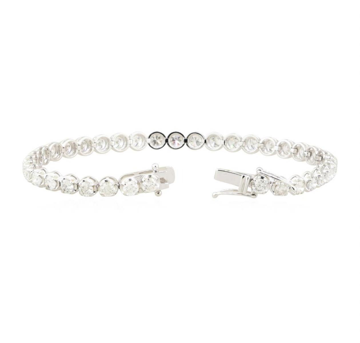 One electronically tested 18KT white gold ladies cast & assembled diamond tennis bracelet. The seven and one quarter inch length bracelet features a flexible diamond ribbon, terminating in a concealed clasp with twin safeties. Trademark is Orianne. Identified with markings of "750." Bright polish finish.Tennis bracelets & necklaces got their unusual name from an incident involving the U.S. professional tennis player Chris Evert during a tennis match in the 1980's. Evert had been wearing an expensive diamond bracelet, an inline string of individually-set diamonds. Previously these bracelets were known as eternity bracelets. When the clasp snapped during play, she asked the officials to stop the tennis match until the bracelet could be found. Since that day, bracelets and necklaces featuring an inline string of diamonds have been called tennis bracelets and tennis necklaces. Condition is new, good workmanship. Containing: Thirty-Seven prong set round brilliant cut diamonds, measuring 3.70 - 3.60 x 2.19mm (depth est.) approximate total weight of 37 Stones = 7.05ct. The clarity & color grade reflect the overall average for the group. Graded in the setting. Clarity SI-3 to I-2 Color F - H Total Weight of Diamonds 7.05 ct. Total Weight of Bracelet 11.80 gm Estimated Retail Value $ 23,255.00 US