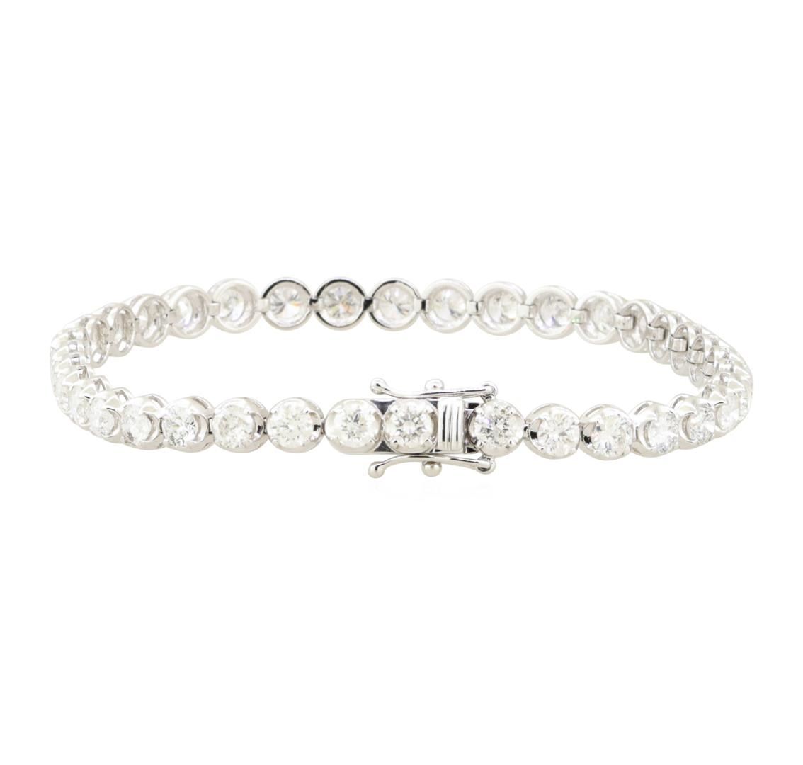 One electronically tested 18KT white gold ladies cast & assembled diamond tennis bracelet. The seven and one quarter inch length bracelet features a flexible diamond ribbon, terminating in a concealed clasp with twin safeties. Trademark is Orianne. Identified with markings of "750." Bright polish finish.Tennis bracelets & necklaces got their unusual name from an incident involving the U.S. professional tennis player Chris Evert during a tennis match in the 1980's. Evert had been wearing an expensive diamond bracelet, an inline string of individually-set diamonds. Previously these bracelets were known as eternity bracelets. When the clasp snapped during play, she asked the officials to stop the tennis match until the bracelet could be found. Since that day, bracelets and necklaces featuring an inline string of diamonds have been called tennis bracelets and tennis necklaces. Condition is new, good workmanship. Containing: Thirty-Seven prong set round brilliant cut diamonds, measuring 3.70 - 3.60 x 2.19mm (depth est.) approximate total weight of 37 Stones = 7.05ct. The clarity & color grade reflect the overall average for the group. Graded in the setting. Clarity SI-3 to I-2 Color F - H Total Weight of Diamonds 7.05 ct. Total Weight of Bracelet 11.80 gm Estimated Retail Value $ 23,255.00 US