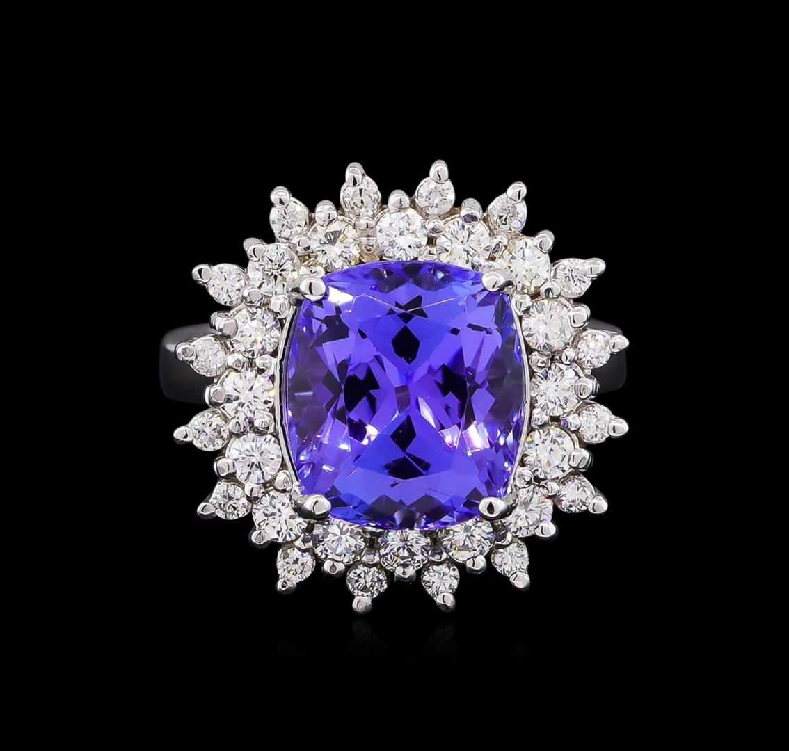 One electronically tested 14KT white gold ladies cast tanzanite and diamond ring with a bright polish finish. The featured tanzanite is set within a diamond floret supported by a ribbed under gallery, completed by a three millimeter wide band. Identified with markings of "14K". Condition is new, good workmanship. Containing: One prong set rectangular cushion mixed cut natural tanzanite, measuring 11.60 x 10.10 x 7.70mm, approximate weight of 7.05ct., clarity is eye clean, type I, medium dark, very slightly grayish, bluish violet color, (GIA bV 6/3), cut is good. Transmitting light with no distortion, transparent. Colored Stone Grading Report attached. Graded in the setting. Tanzanite is a very rare gemstone that is only found in the country of Tanzania. Originally discovered in 1967. Tiffany & Company, named the stone Tanzanite. It is found in the Usumburu Mountains that border the Umba Valley of northern Tanzania. Tanzanite occurs in gray, brown, violet, blue, reddish-purple, & green. The gem is interesting because of its exceptional pleochroism. Rotated in different directions a tanzanite will exhibit multiple changes of color. Tanzanite has a low tolerance to ultrasonic cleaning, and should not be cleaned using this method. Thirty-Two prong set round brilliant cut diamonds approximate total weight of 32 Stones = 0.98ct. The clarity grade reflects the entire range of clarity for this group. Graded in the setting. Clarity: VS-2 to I-1. Color: D - F. Total Weight of Colored Stones 7.05ct. Total Weight of Diamonds 0.98ct. Total Weight of Ring 11.15gm. AIG Appraised at $20,510.00.