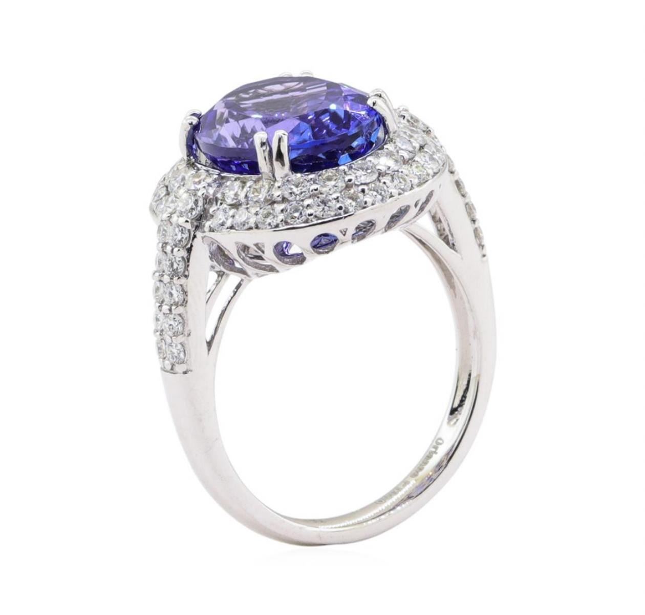 One electronically tested platinum ladies cast tanzanite & diamond ring. The featured tanzanite is set within a diamond bezel, supported by a lattice under gallery and diamond set shoulders, completed by a three millimeter wide band. Bright polish finish. Trademark is Orianne. Identified with markings of "PT950". Condition is new, good workmanship. Containing: One prong set oval modified brilliant cut natural tanzanite, measuring 13.13 x 10.14 x 7.20mm, exact weight 7.05ct., type I Clarity is eye clean, medium, very slightly grayish, violet-blue color, (GIA VB 5/3), cut is good. Transmitting light with no distortion, transparent. GIA Gemological Report attached. Graded loose prior to setting in the GIA Laboratory, Report #1172871664.Tanzanite is a very rare gemstone that is only found in the country of Tanzania. Originally discovered in 1967. Tiffany & Company, named the stone Tanzanite. It is found in the Usumburu Mountains that border the Umba Valley of northern Tanzania. Tanzanite occurs in gray, brown, violet, blue, reddish-purple, & green. The gem is interesting because of its exceptional pleochroism. Rotated in different directions a tanzanite will exhibit multiple changes of color. Tanzanite has a low tolerance to ultrasonic cleaning, and should not be cleaned using this method. Seventy prong set round brilliant cut diamonds, measuring 1.90 - 1.40 x 0.99mm (depth est.) exact total weight 70 Stones = 1.20 ct. Graded in the setting. Clarity SI-1 to SI-2 Color F - H Total Weight of Colored Stones 7.05 ct. Total Weight of Diamonds 1.20 ct. Total Weight of Ring 10.50 gm Estimated Retail Value $ 21,990.00 US