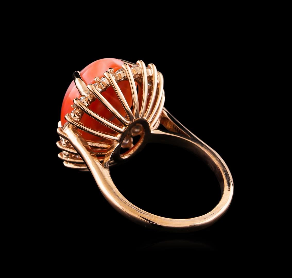 One electronically tested 14KT rose gold ladies cast coral and diamond ring with a bright polish finish. The featured coral cabochon is set within a diamond floret supported by a ribbed under gallery, completed by a two millimeter wide band. Identified with markings of "14K". Condition is new, good workmanship. Containing: One prong set oval cabochon cut natural salmon coral, measuring 16.00 x 12.10 x 5.10mm, approximate weight of 7.06ct., medium, very slightly brownish, orangy red color, (GIA oR 5/3), cut is good. Transmitting light very diffusely, opaque. Naturally occurring internal & external characteristics are present. Graded in the setting. Salmon Coral is formed undersea by microscopic animals called coral polyps. These tiny creatures form minute, hard shells. As a colony grows, it takes on complex branching, tree-like forms which allows the maximum number of polyps to be fed by the nutrients in the water. It grows about one quarter inch per year. This color of coral is commonly treated to improve or change the color and stability. Evidence that may confirm this is typically lacking. Twenty prong set round brilliant cut diamonds, measuring 2.40 - 2.35 x 1.43mm (depth est.) approximate total weight of 20 Stones = 0.98ct. Graded in the setting. Clarity: SI-2 to I-2. Color: G - I. Total Weight of Colored Stones 7.06ct. Total Weight of Diamonds 0.98ct. Total Weight of Ring 7.66gm. AIG Appraised at $5,425.00.