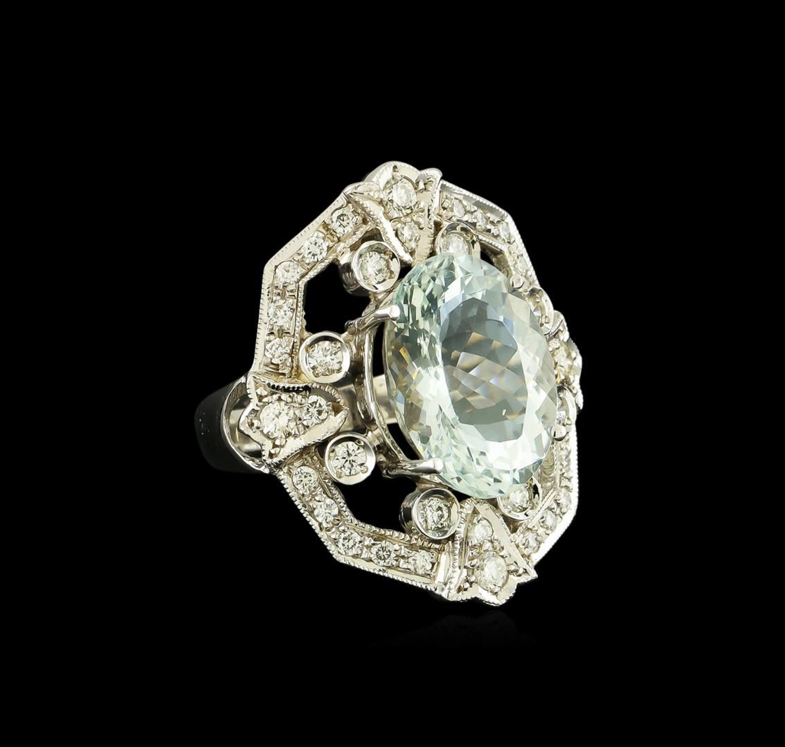 One electronically tested 14KT white gold lady's cast fashion ring with a tapered shank with a bright polish with milgrain detailing finish. The featured lady's ring has a shank measuring 2.68 millimeters wide. Condition is new, good workmanship. Containing: One pave' set oval modified brilliant cut natural aquamarine, measuring 15.10 x 11.15 x 7.59mm, approximate weight of 7.07ct., clarity is eye clean, type I, light, very slightly grayish, very slightly greenish blue color, (GIA vslgB 3/3), cut is good. Transmitting light with no distortion, transparent. Colored gemstones are presumed to have been subjected to commonly used enhancement processes. Graded in the setting. Twelve prong set round brilliant cut diamonds, measuring 2.30 - 2.00 x 1.33mm (depth est.) approximate total weight of 12 Stones = 0.45ct. Graded in the setting. Clarity: VS-2 to SI-1. Color: H - I. Cut Good Twenty-Four prong set round brilliant cut diamonds, measuring 1.70 - 1.60 x 0.99mm (depth est.) approximate total weight of 24 Stones = 0.38ct. Graded in the setting. Clarity: SI-1 to SI-2. Color: H - I. Cut Good. Total Weight of Colored Stones 7.07ct. Total Weight of Diamonds 0.83ct. Total Weight of Ring 9.50gm. GAS Appraised at $8,440.00.