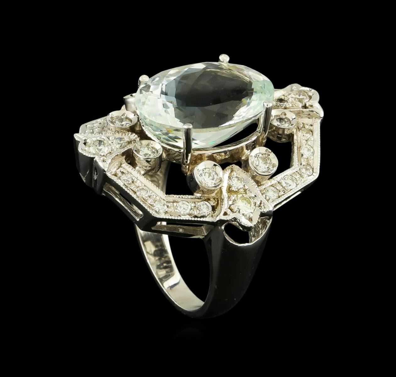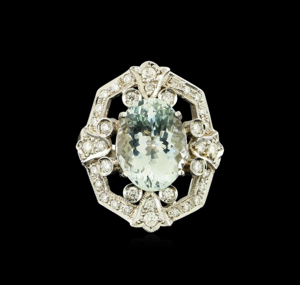One electronically tested 14KT white gold lady's cast fashion ring with a tapered shank with a bright polish with milgrain detailing finish. The featured lady's ring has a shank measuring 2.68 millimeters wide. Condition is new, good workmanship. Containing: One pave' set oval modified brilliant cut natural aquamarine, measuring 15.10 x 11.15 x 7.59mm, approximate weight of 7.07ct., clarity is eye clean, type I, light, very slightly grayish, very slightly greenish blue color, (GIA vslgB 3/3), cut is good. Transmitting light with no distortion, transparent. Colored gemstones are presumed to have been subjected to commonly used enhancement processes. Graded in the setting. Twelve prong set round brilliant cut diamonds, measuring 2.30 - 2.00 x 1.33mm (depth est.) approximate total weight of 12 Stones = 0.45ct. Graded in the setting. Clarity: VS-2 to SI-1. Color: H - I. Cut Good Twenty-Four prong set round brilliant cut diamonds, measuring 1.70 - 1.60 x 0.99mm (depth est.) approximate total weight of 24 Stones = 0.38ct. Graded in the setting. Clarity: SI-1 to SI-2. Color: H - I. Cut Good. Total Weight of Colored Stones 7.07ct. Total Weight of Diamonds 0.83ct. Total Weight of Ring 9.50gm. GAS Appraised.