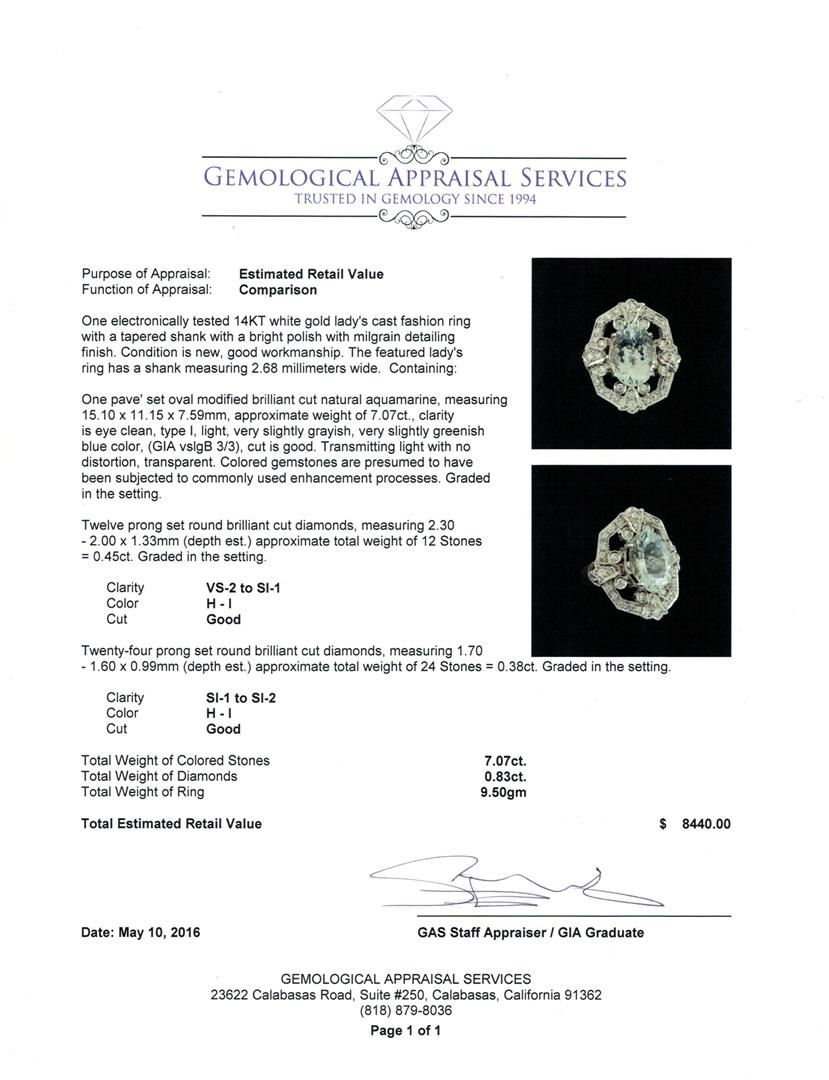 One electronically tested 14KT white gold lady's cast fashion ring with a tapered shank with a bright polish with milgrain detailing finish. The featured lady's ring has a shank measuring 2.68 millimeters wide. Condition is new, good workmanship. Containing: One pave' set oval modified brilliant cut natural aquamarine, measuring 15.10 x 11.15 x 7.59mm, approximate weight of 7.07ct., clarity is eye clean, type I, light, very slightly grayish, very slightly greenish blue color, (GIA vslgB 3/3), cut is good. Transmitting light with no distortion, transparent. Colored gemstones are presumed to have been subjected to commonly used enhancement processes. Graded in the setting. Twelve prong set round brilliant cut diamonds, measuring 2.30 - 2.00 x 1.33mm (depth est.) approximate total weight of 12 Stones = 0.45ct. Graded in the setting. Clarity: VS-2 to SI-1. Color: H - I. Cut Good Twenty-Four prong set round brilliant cut diamonds, measuring 1.70 - 1.60 x 0.99mm (depth est.) approximate total weight of 24 Stones = 0.38ct. Graded in the setting. Clarity: SI-1 to SI-2. Color: H - I. Cut Good. Total Weight of Colored Stones 7.07ct. Total Weight of Diamonds 0.83ct. Total Weight of Ring 9.50gm. GAS Appraised.