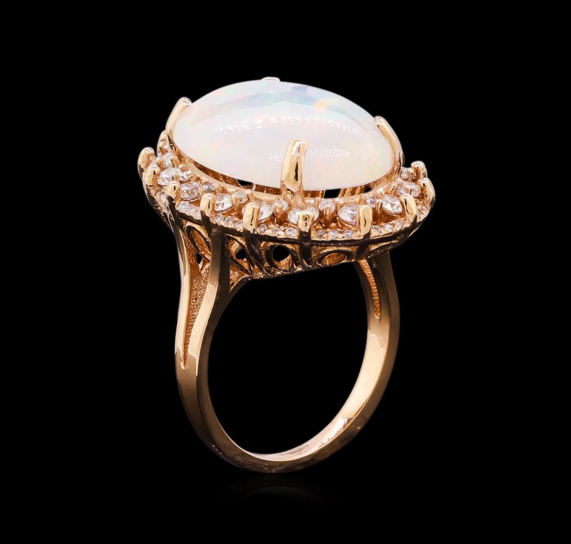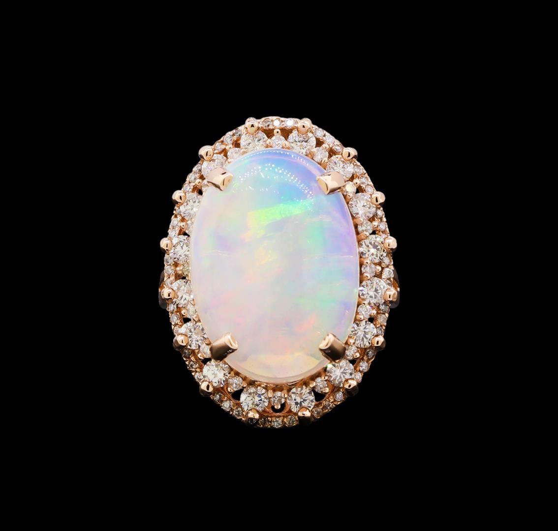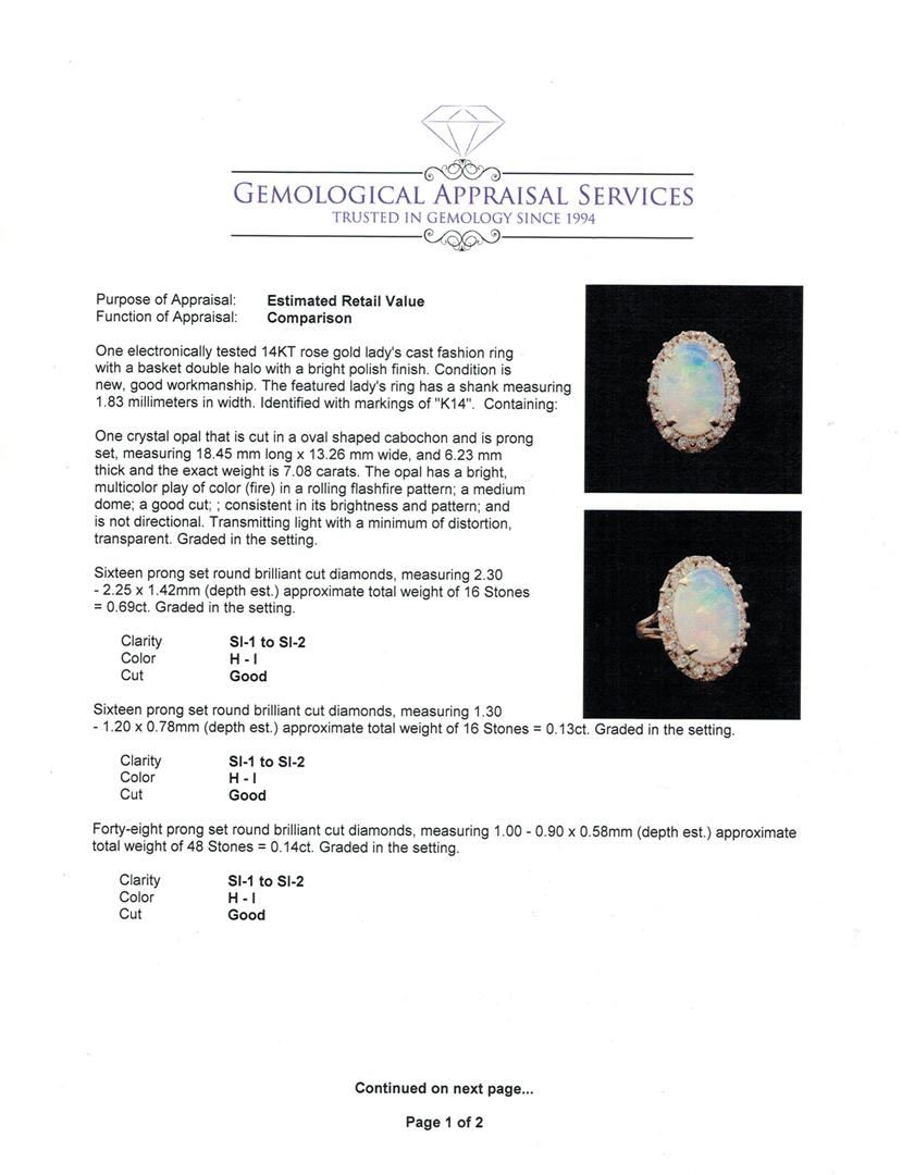 One electronically tested 14KT rose gold lady's cast fashion ring with a basket double halo with a bright polish finish. The featured lady's ring has a shank measuring 1.83 millimeters in width. Identified with markings of "K14". Condition is new, good workmanship. Containing: One crystal opal that is cut in a oval shaped cabochon and is prong set, measuring 18.45 mm long x 13.26 mm wide, and 6.23 mm thick and the exact weight is 7.08 carats. The opal has a bright, multicolor play of color (fire) in a rolling flashfire pattern; a medium dome; a good cut; ; consistent in its brightness and pattern; and is not directional. Transmitting light with a minimum of distortion, transparent. Graded in the setting. Sixteen prong set round brilliant cut diamonds, measuring 2.30 - 2.25 x 1.42mm (depth est.) approximate total weight of 16 Stones = 0.69ct. Graded in the setting. Clarity: SI-1 to SI-2. Color: H - I. Cut Good Sixteen prong set round brilliant cut diamonds, measuring 1.30 - 1.20 x 0.78mm (depth est.) approximate total weight of 16 Stones = 0.13ct. Graded in the setting. Clarity: SI-1 to SI-2. Color: H - I. Cut Good Forty-Eight prong set round brilliant cut diamonds, measuring 1.00 - 0.90 x 0.58mm (depth est.) approximate total weight of 48 Stones = 0.14ct. Graded in the setting. Clarity: SI-1 to SI-2. Color: H - I. Cut Good. Total Weight of Diamonds 0.96ct. Total Weight of Opals 7.08ct. Total Weight of Ring 9.40gm. GAS Appraised at $6,120.00.