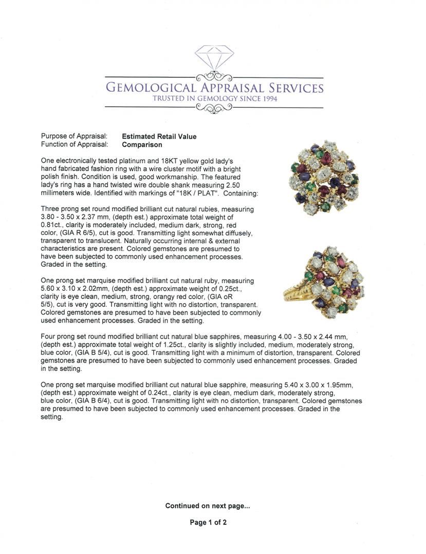 One electronically tested platinum and 18KT yellow gold lady's hand fabricated fashion ring with a wire cluster motif with a bright polish finish. The featured lady's ring has a hand twisted wire double shank measuring 2.50 millimeters wide. Identified with markings of '18K / PLAT'. Condition is used, good workmanship. Containing: Three prong set round modified brilliant cut natural rubies, measuring 3.80 - 3.50 x 2.37 mm, (depth est.) approximate total weight of 0.81ct., clarity is moderately included, medium dark, strong, red color, (GIA R 6/5), cut is good. Transmitting light somewhat diffusely, transparent to translucent. Naturally occurring internal & external characteristics are present. Colored gemstones are presumed to have been subjected to commonly used enhancement processes. Graded in the setting. One prong set marquise modified brilliant cut natural ruby, measuring 5.60 x 3.10 x 2.02mm, (depth est.) approximate weight of 0.25ct., clarity is eye clean, medium, strong, orangy red color, (GIA oR 5/5), cut is very good. Transmitting light with no distortion, transparent. Colored gemstones are presumed to have been subjected to commonly used enhancement processes. Graded in the setting. Four prong set round modified brilliant cut natural blue sapphires, measuring 4.00 - 3.50 x 2.44 mm, (depth est.) approximate total weight of 1.25ct., clarity is slightly included, medium, moderately strong, blue color, (GIA B 5/4), cut is good. Transmitting light with a minimum of distortion, transparent. Colored gemstones are presumed to have been subjected to commonly used enhancement processes. Graded in the setting. One prong set marquise modified brilliant cut natural blue sapphire, measuring 5.40 x 3.00 x 1.95mm, (depth est.) approximate weight of 0.24ct., clarity is eye clean, medium dark, moderately strong, blue color, (GIA B 6/4), cut is good. Transmitting light with no distortion, transparent. Colored gemstones are presumed to have been subjected to commonly used enhancement processes. Graded in the setting. Five prong set round modified brilliant cut natural emeralds, measuring 3.40 - 3.20 x 2.15 mm, (depth est.) approximate total weight of 0.70 ct., clarity is moderately included, medium, very slightly grayish, green color, (GIA G 5/3), cut is good. Transmitting light somewhat diffusely, transparent to translucent. Naturally occurring internal & external characteristics are present. Indications of oil residue. Colored gemstones are presumed to have been subjected to commonly used enhancement processes. Graded in the setting. Three prong set oval shaped cut diamonds, measuring 4.80 x 3.35 x 2.56mm (depth est.) approximate total weight of 3 Stones = 0.80 ct. Graded in the setting. Color G - H Clarity VS-2 to SI-1 Cut Good Twelve prong set round brilliant cut diamonds, measuring 4.40 - 3.80 x 2.46mm (depth est.) approximate total weight of 12 Stones = 3.03ct. Graded in the setting. Color H - I Clarity VS-2 to SI-1 Cut Good. Total Weight of Colored Stones 3.25ct.. Total Weight of Diamonds 3.83ct.. Total Weight of Ring 13.80gm GAS Appraised at $11175.00. GAS Appraised.