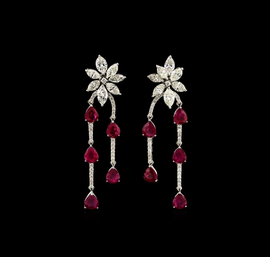 One pair electronically tested 18KT white gold lady's combination cast & assembled dangle flower design earrings with heavy friction backs with a basket setting with a bright polish finish. The featured ladies' earrings have a 57 millimeter dangle. Identified with markings of "18K 750". Condition is new, good workmanship. Containing: Ten prong set pear modified brilliant cut natural rubies, measuring 6.30 x 5.00 x 2.80mm, approximate total weight of 7.08ct., clarity is moderately included, type II, medium dark, moderately strong, red color, (GIA R 6/4), cut is good. Colored gemstones are presumed to have been subjected to commonly used enhancement processes. Graded in the setting. Fourteen prong set marquise shaped cut diamonds, measuring 6.00 x 3.10 x 2.58mm (depth est.) approximate total weight of 14 Stones = 3.83ct. Graded in the setting. Clarity: VS-2 to SI-2. Color: G - I. Cut Very Good Sixty prong set round brilliant cut diamonds, measuring 1.30 - 1.20 x 0.78mm (depth est.) approximate total weight of 60 Stones = 0.46ct. Graded in the setting. Clarity: SI-1 to I-1. Color: H - I. Cut Good. Total Weight of Colored Stones 7.08ct. Total Weight of Diamonds 4.29ct. Total Weight of Earrings 9.60gm. GAS Appraised at $18,970.00.