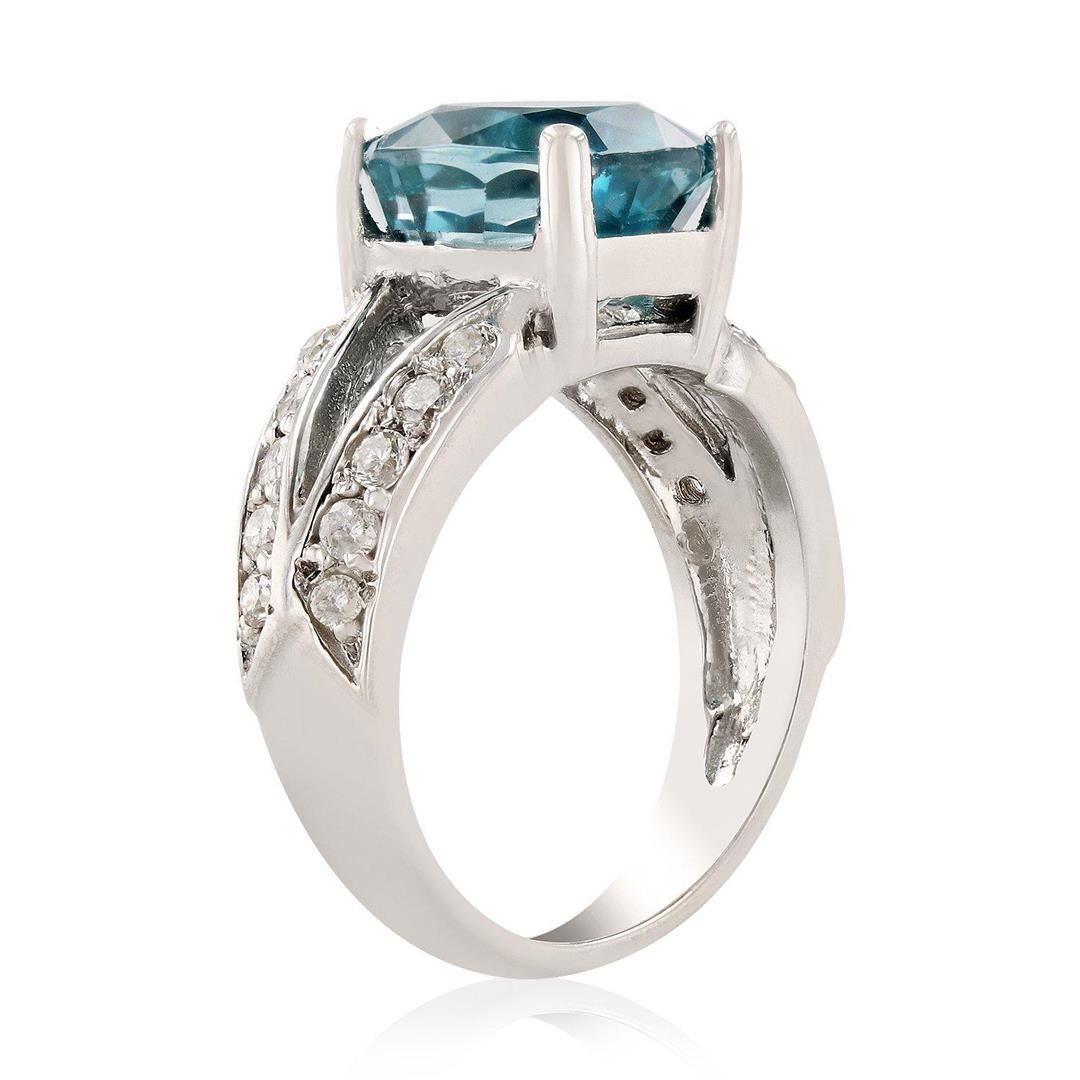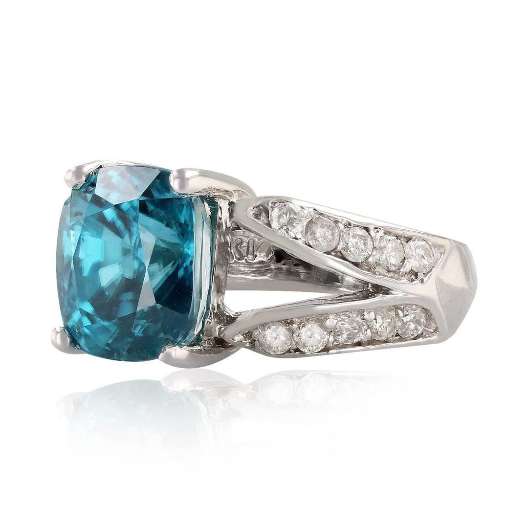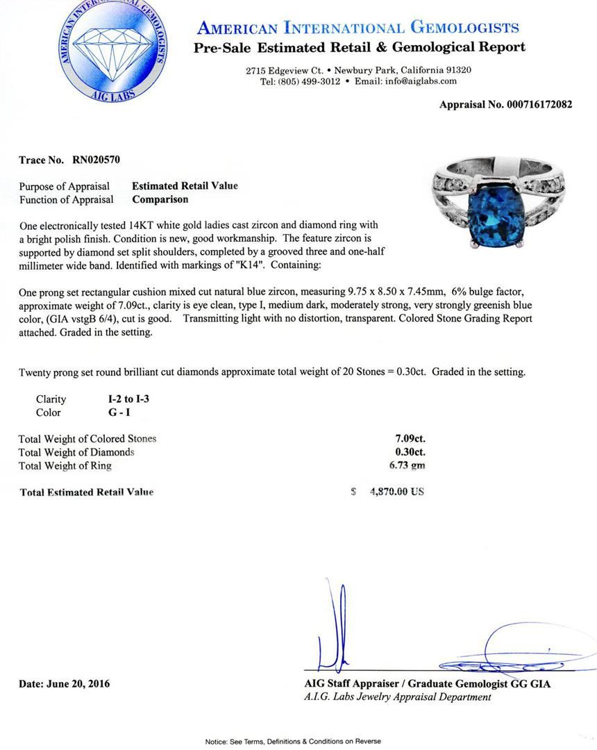 7.09ctw Blue Zircon and 0.30ctw Diamond 14K White Gold Ring. One electronically tested 14KT white gold ladies cast zircon and diamond ring with a bright polish finish. Condition is new, good workmanship. The feature zircon is supported by diamond set split shoulders, completed by a grooved three and one-half millimeter wide band. Identified with markings of "K14". Containing: One prong set rectangular cushion mixed cut natural blue zircon, measuring 9.75 x 8.50 x 7.45mm, 6% bulge factor, approximate weight of 7.09ct., clarity is eye clean, type I, medium dark, moderately strong, very strongly greenish blue color, (GIA vstgB 6/4), cut is good. Transmitting light with no distortion, transparent. Colored Stone Grading Report attached. Graded in the setting. Twenty prong set round brilliant cut diamonds approximate total weight of 20 Stones = 0.30ct. Graded in the setting. Clarity I-2 to I-3 Color G - I Total Weight of Colored Stones 7.09ct. Total Weight of Diamonds 0.30ct. Total Weight of Ring 6.73 gm