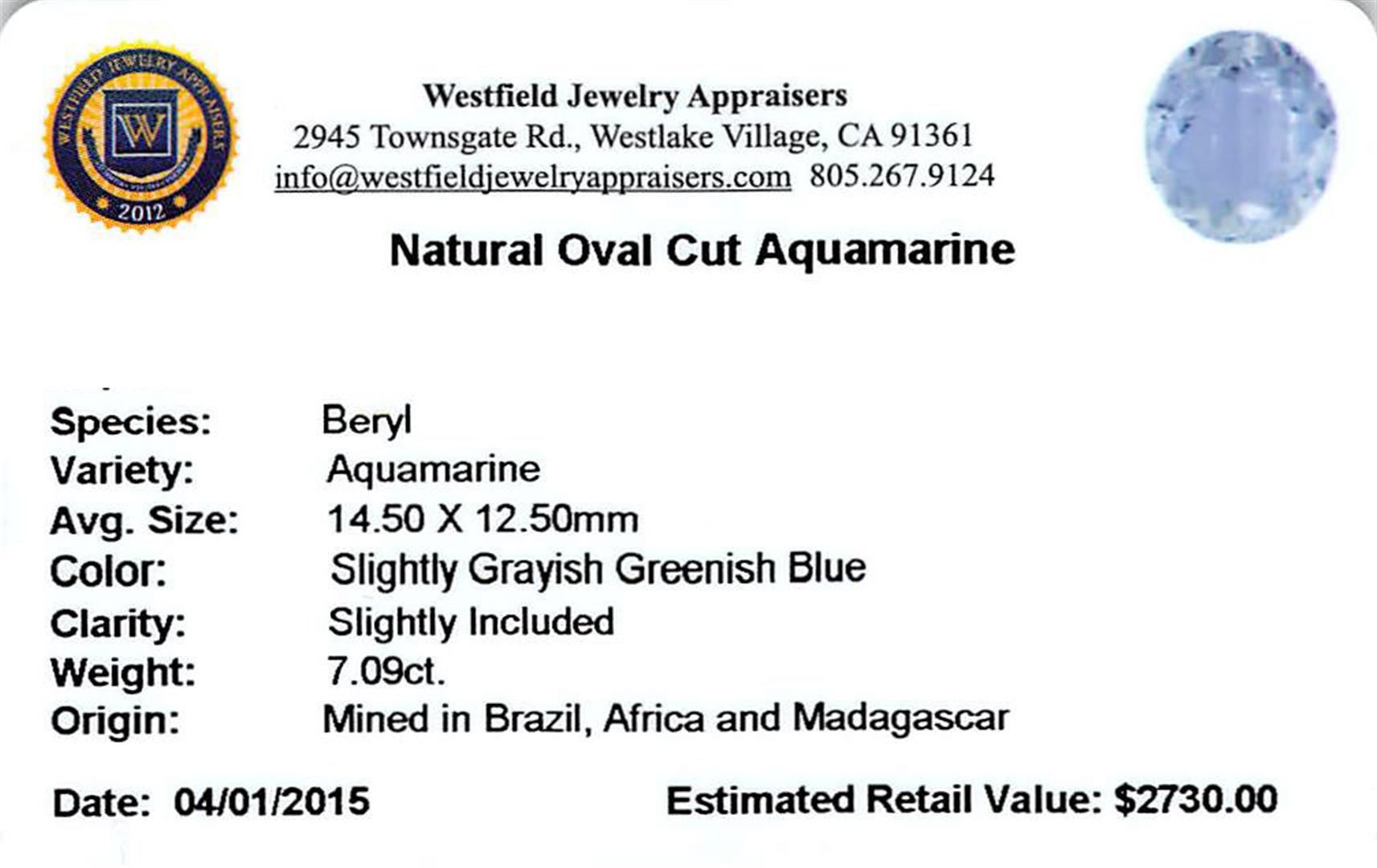 One oval cut natural aquamarine approximate weight of 7.09ct., clarity is slightly included, type I, medium light, slightly grayish, very slightly greenish blue color, (GIA vslgB 4/2), cut is good. Westfield Appraised at $2,730.00.