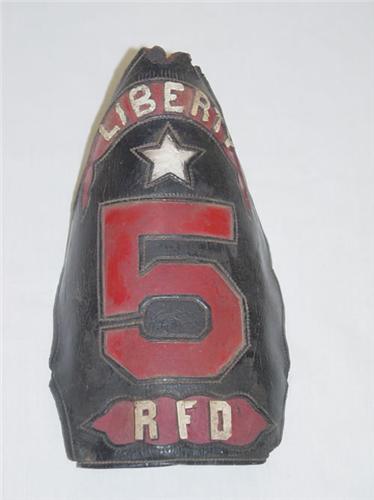 7 1/2" BLACK LEATHER HIGH EAGLE FIRE HELMET FRONT W/ WHITE CUT-OUT LETTERS "LIBERTY 5 R.F.D." & WHITE CUT-OUT STAR;