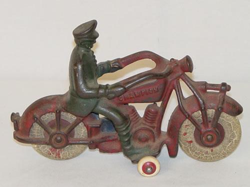 7 1/2" CHAMPION CAST IRON MOTORCYCLE W/ DRIVER-RED PAINTED BIKE W/ GREEN DRIVER - PAINT WEAR & LOSSES, REPLACEMENT TO RUBBER ON MID WHEELS