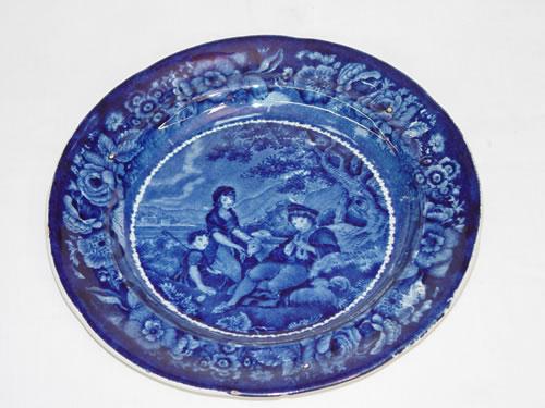 7 1/2" DARK BLUE STAFFORDSHIRE PLATE-PASTORAL PATTERN, ALSO MARKED E. & G. PHILLIPS, LONGPORT - HAS SINGLE 1/2" UNDER RIM CHIPS, EDGE WEAR, IMPERFECTIONS