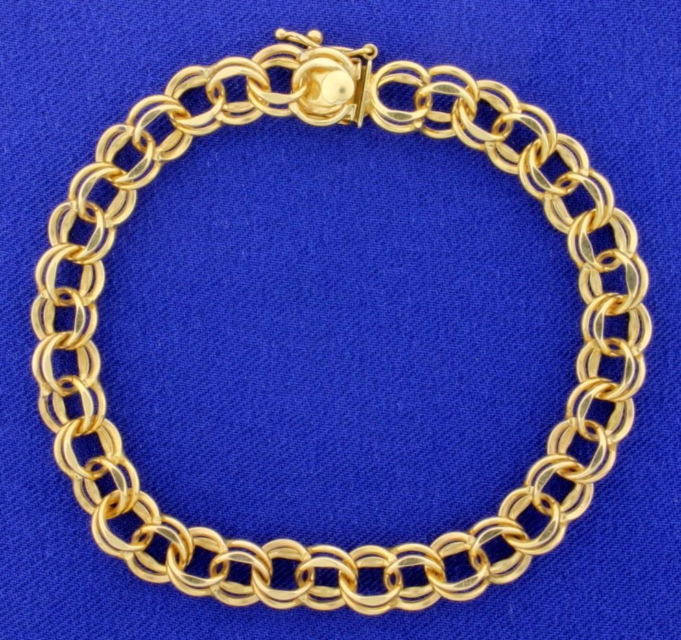 In 14K yellow gold it is 7mm wide and has a safety clasp. 15.1g