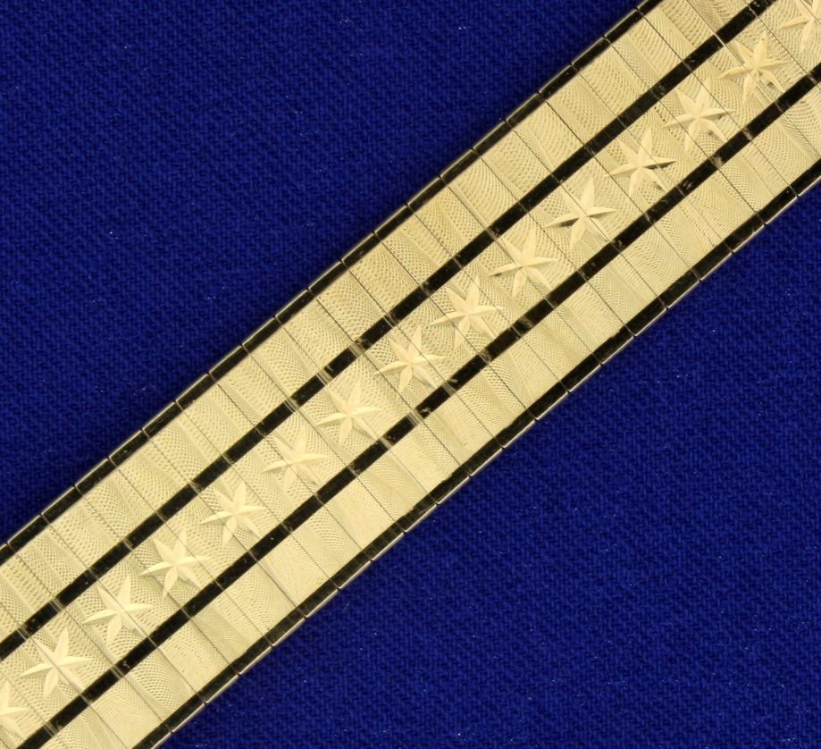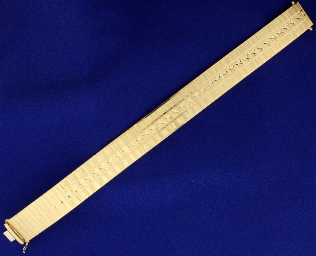In 14k yellow gold, 15.2mm wide with double safety clasps. 25.8g.