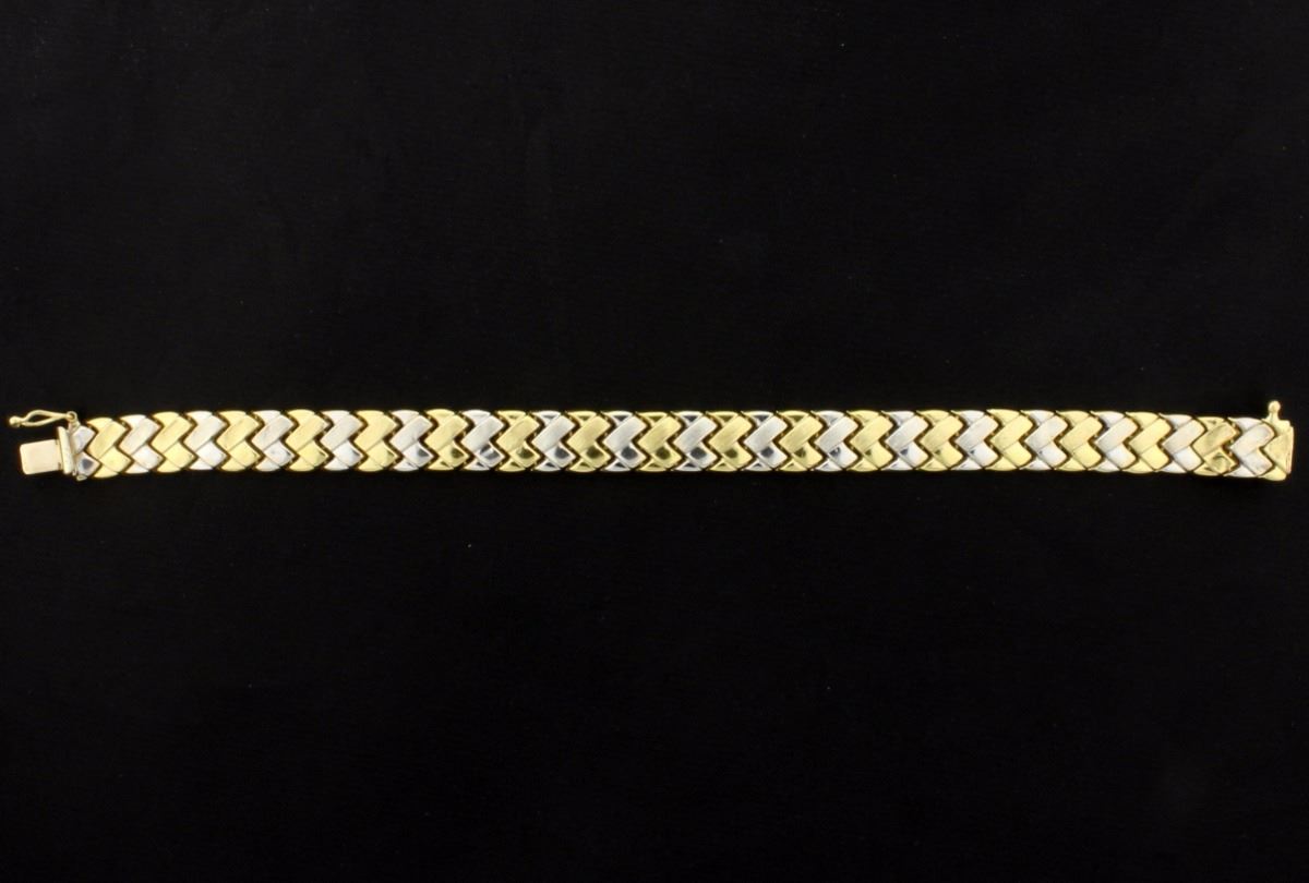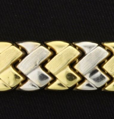 In 14K yellow & white gold, part brushed part glossy finish. Very unique design. It has a safety clasp. 13.2g