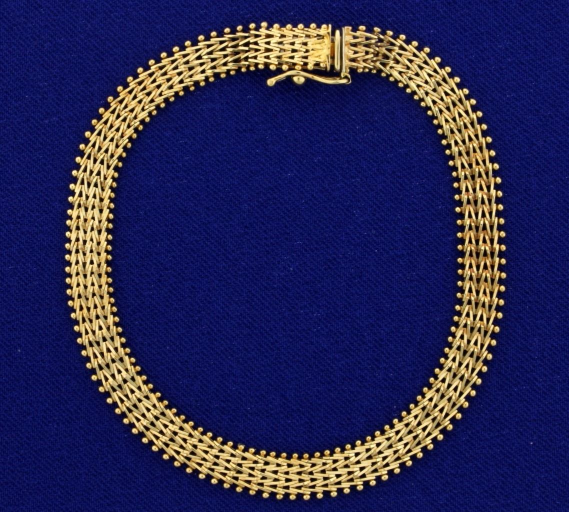 In 14k yellow gold, 7 1/2" long and 6.5mm wide with safety clasp. 10.5g.