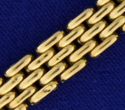 In 14k yellow gold. 8.4mm wide with a unique clasp. 21.3g.