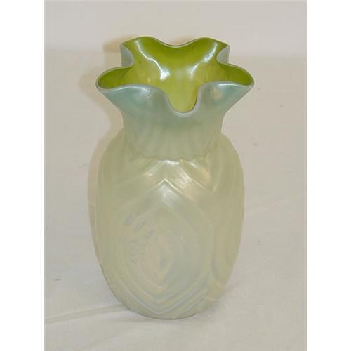 7 1/2" LOETZ TYPE ART GLASS VASE W/ RUFFLED TOP- OPALESCENT WHITE SHADED TO GREEN, UNMARKED - MINOR WEAR