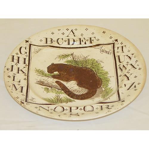 7 1/2" STAFFORDSHIRE ABC CHILDS PLATE W/ TRANSFER DECORATION OF THE ALPHABET & THE LEOPARD-WILD ANIMAL SERIES-W/ ENGLISH REGISTRY MARK & B.P. CO. - GLAZE CRAZING, STAIN, IMPERFECTIONS;