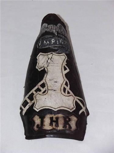 7 1/2" BLACK LEATHER ANDERSON and JONES HIGH EAGLE HELMET FRONT SHIELD W/ CUT-OUT #1 LADDER and HOOK and JHR CUT-OUT LETTERS - NEWLY PAINTED EAGLE and EMPIRE ON TOP RIM, DAMAGE and LOSSES;