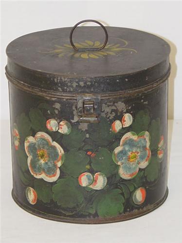 7 1/4" 19TH CENT. TOLEWARE CANISTER W/ LEAFY FLORAL DECORATION & YELLOW HIGHLIGHTING - PAINT LOSS, IMPERFECTIONS