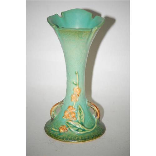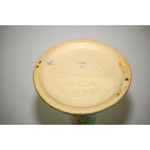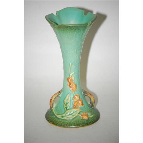 7 1/4" BITTERSWEET ROSEVILLE POTTERY BASE - ROSEVILLE<BR>POTTERY BITTERSWEET PATTERN FLOWER VASE W/ HANDLES<BR>#879-7 - SMALL CHIP REPAIR ON BASE RIM, CRAZING, WEAR<BR>& IMPERFECTIONS