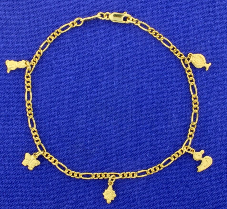 Italian made 10K yellow gold, this bracelet has a cat, butterfly, bug, duck, and fish charm. 3.3g