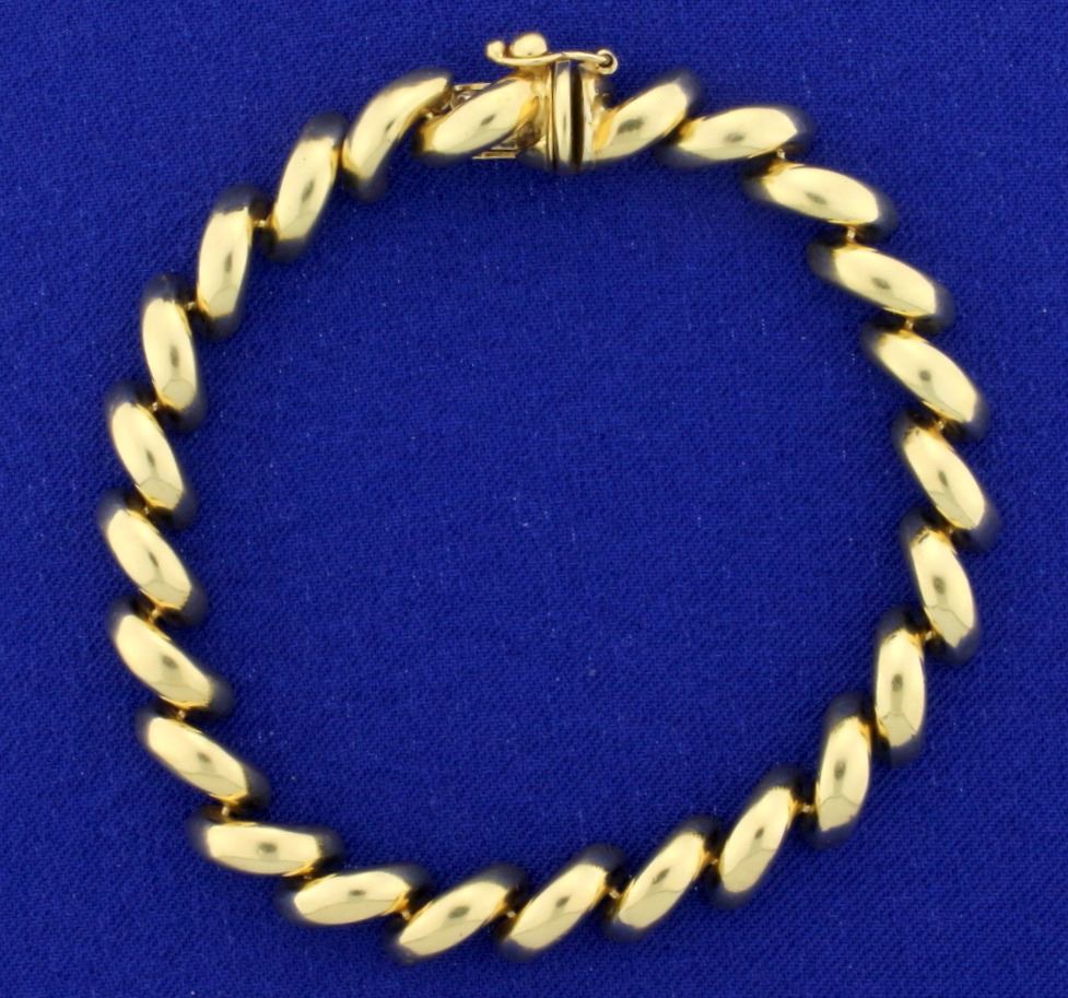 In 14k yellow gold, 7 1/4" long and 7.2mm wide with safety clasp. 16.3g.