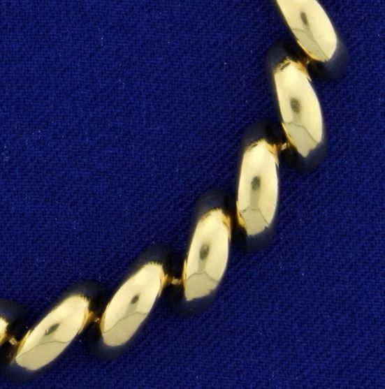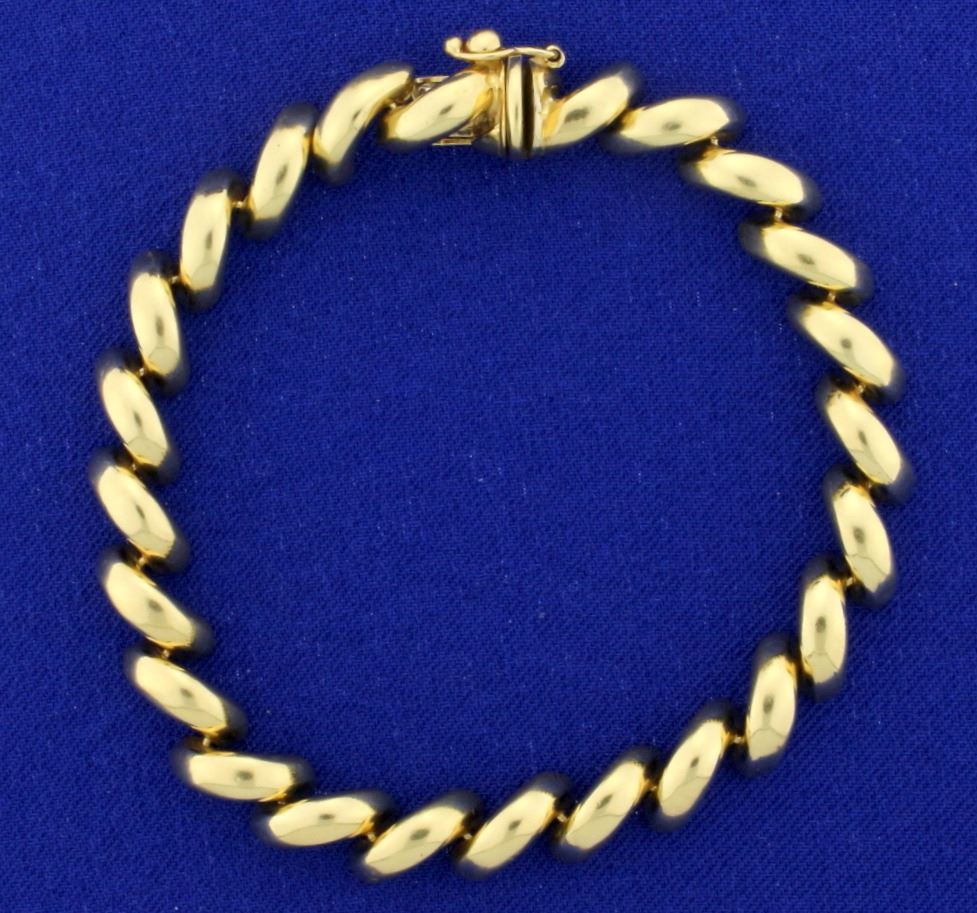 In 14k yellow gold, 7 1/4" long and 7.2mm wide with safety clasp. 16.3g.