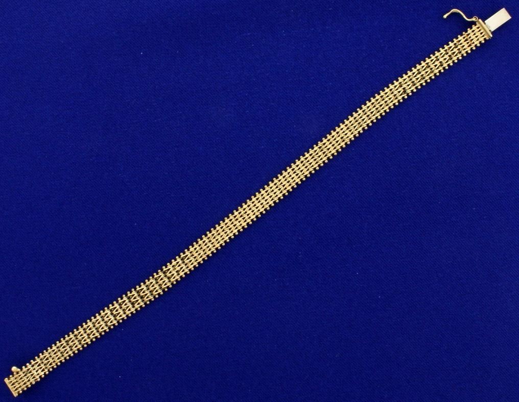 In 14k yellow gold, 7 1/4" long and 6.5mm wide with safety clasp. 10.5g.