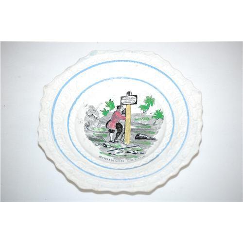 7 1/4" STAFFORDSHIRE CHILDS PLATE W/ POLYCHROME HIGHLIGHTED TRANSFER DECORATION OF ROBINSON CRUSOE & SHAPED EDGE W/ FANCY RAISED BORDER DESIGNS - WEAR, IMPERFECTIONS;