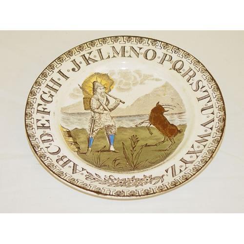 7 1/8" STAFFORDSHIRE ABC CHILDS PLATE W/ TRANSFER DECORATION OF THE ALPHABET & "CRUSOE FINDING THE FOOTPRINTS"-W/ ENGLISH REGISTRY MARK & B.P. CO. TUNSTALL ENGLAND - STAIN, IMPERFECTIONS;