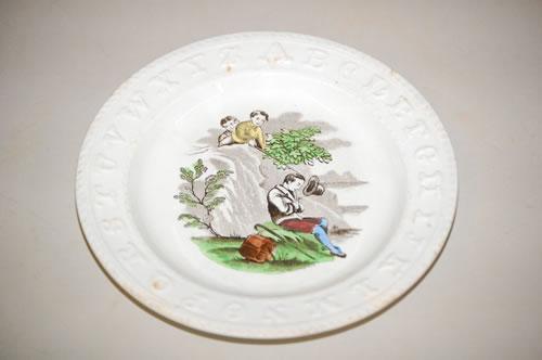 7 1/8" STAFFORDSHIRE TRANSFER CHILDS ABC PLATE - STAFFORDSHIRE TRANSFER PLATE W/ POLYCHROME DECORATION- UNTITLED, MARKED ELSMORE & SON ENGLAND ON BACK - CRAZING, LIGHT STAIN, IMPERFECTIONS