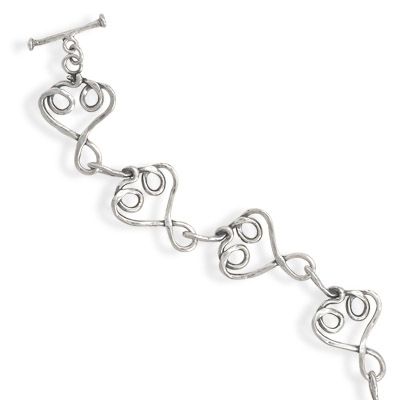 7" + 1" extension oxidized hammered sterling silver swirled heart link toggle bracelet. Each heart link is approximately 30mm x 16.5mm. .925 Sterling Silver